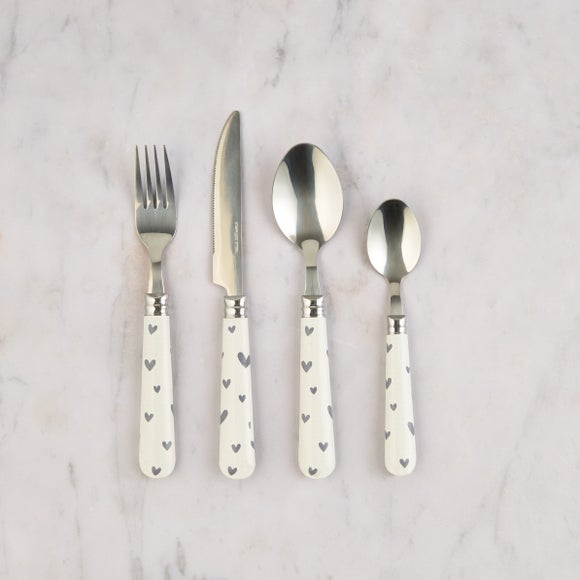 Detailed with dainty grey heart prints on a classic white background, this cutlery set will add some love to your dining table. Hard-wearing and durable, this set is made from high quality stainless steel. Perfect for your daily needs, whether breakfast, lunch, dinner and even dessert. This set is easy to clean by simply popping it into the dishwasher, making it perfect for you to use everyday and saving you on hand washing!