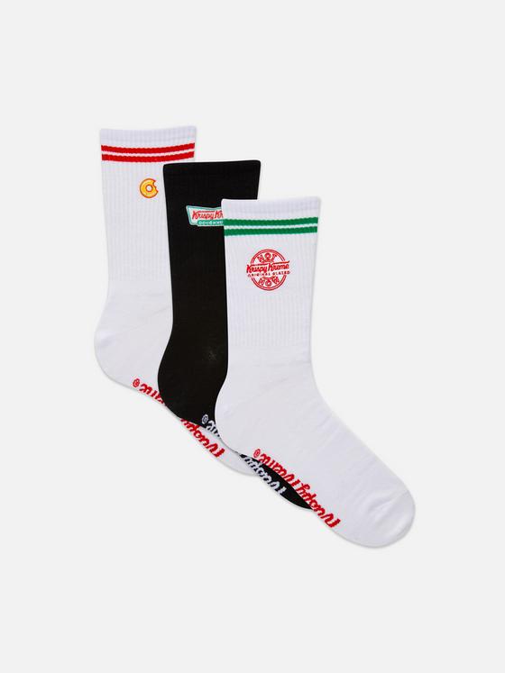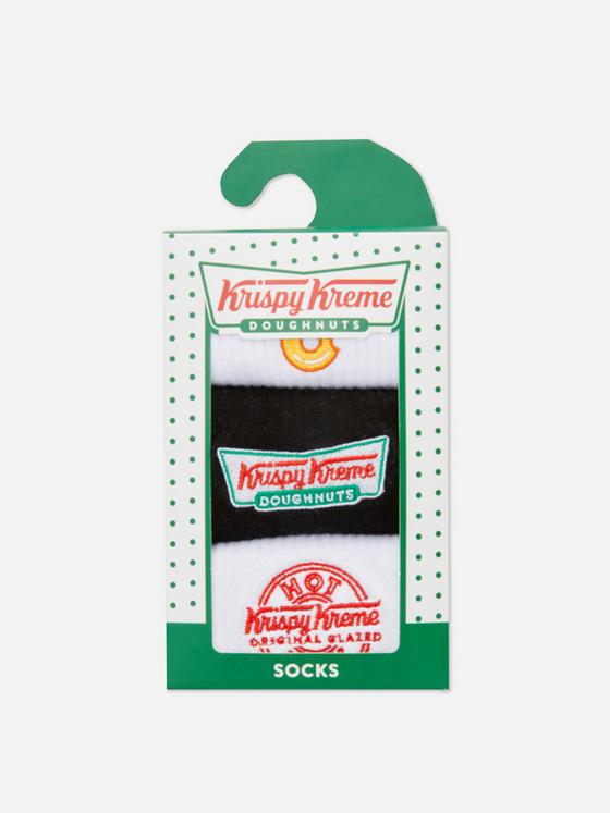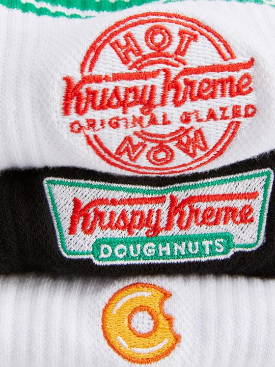 Three pairs of rib cuff crew-length socks with Krispy Kreme designs