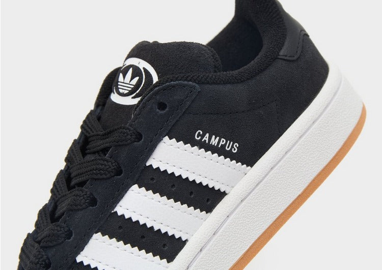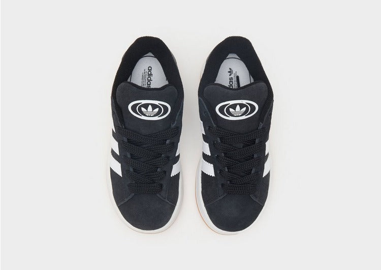 Put a chunky look on their foot with these children's Campus 00s trainers from adidas Originals. In a Core Black and White colourway, these skate-inspired sneakers have a sturdy suede upper and a textile lining. They feature a wide, padded tongue and elastic laces for a comfy fit, while the thick midsole sits on a Gum 2 rubber outsole for heritage style and grip. Finished off with the 3-Stripes and Campus branding to the sidewalls, the Y2K Trefoil on the tongue, and the classic Trefoil to the heel. | JI4331