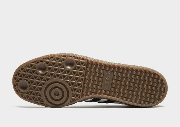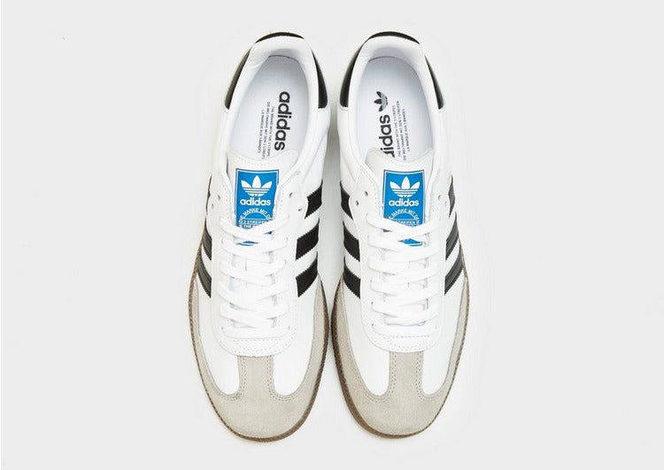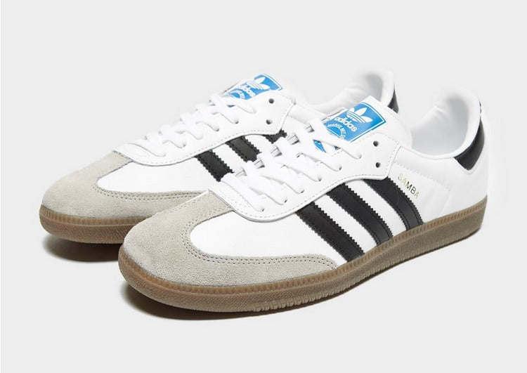 Get yourself some adi OG style with these men's Samba OG trainers from adidas Originals. Keeping its iconic 1950s style, these trainers take their cues from the original football-inspired Samba and are built with a white leather upper and a suede toe guard for premium support and comfort. Sat on a responsive gum midsole, they feature tonal laces and serrated 3-stripes to the sidewalls. Finished up with the golden SAMBA wordmark and Trefoil branding to the tongue._