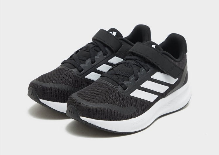 Add a sporty style to their rotation with these children's Runfalcon 5 trainers from adidas. In a Black and White colourway, these kicks have an airy mesh upper with no-sew synthetic details for lasting wear. They have elastic laces with a hook-and-loop ankle strap for a secure fit, and sit above a spongy Cloudfoam midsole for supreme comfort. They have a tough rubber outsole for grippy traction, and are finished with adidas' iconic 3-Stripes to the sidewalls and classic branding throughout. | IE8574