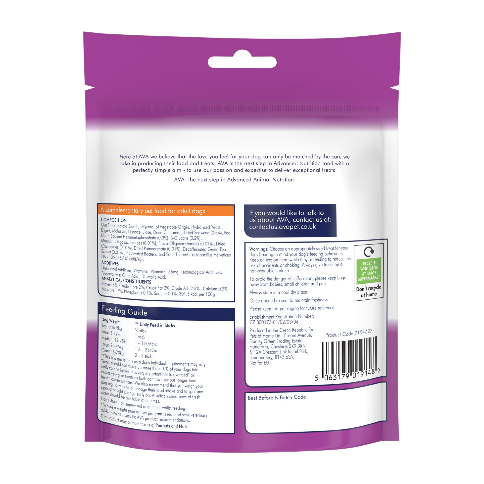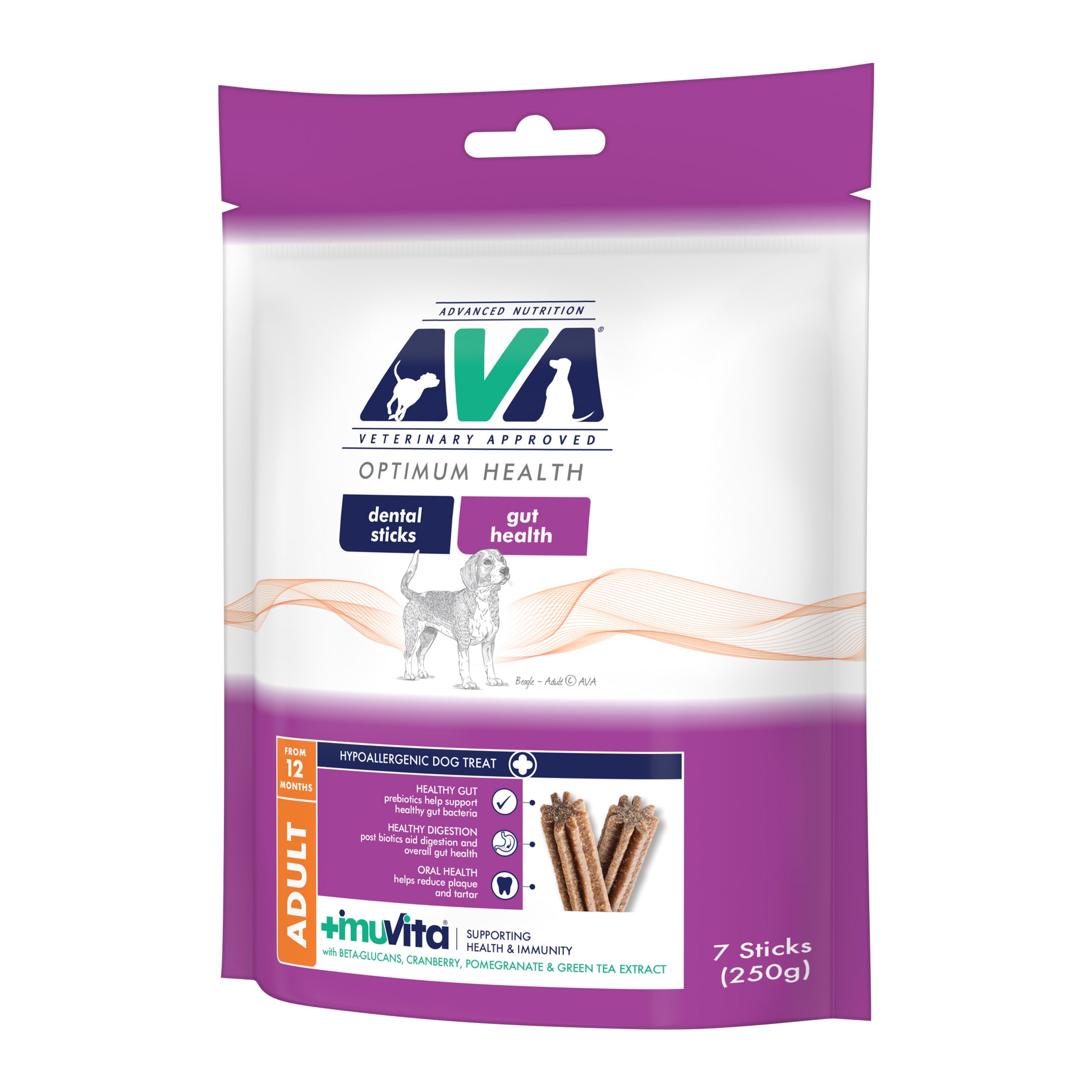 Oral care, with Advanced Nutrition benefits. AVA Advanced Nutrition Veterinary Approved Dental Sticks have been created for the optimum health of your dog. These sticks help reduce plaque and tartar while supporting oral health through chewing, and have a range of additional gut health benefits. Containing prebiotics to promote support healthy gut bacteria and nutrient absorption, they also promote healthy digestion with postbiotics that can also aid overall gut health. As with all AVA treats and food, these sticks contain +imuvita, supporting health and immunity with beta glucans, cranberry and green tea extract.