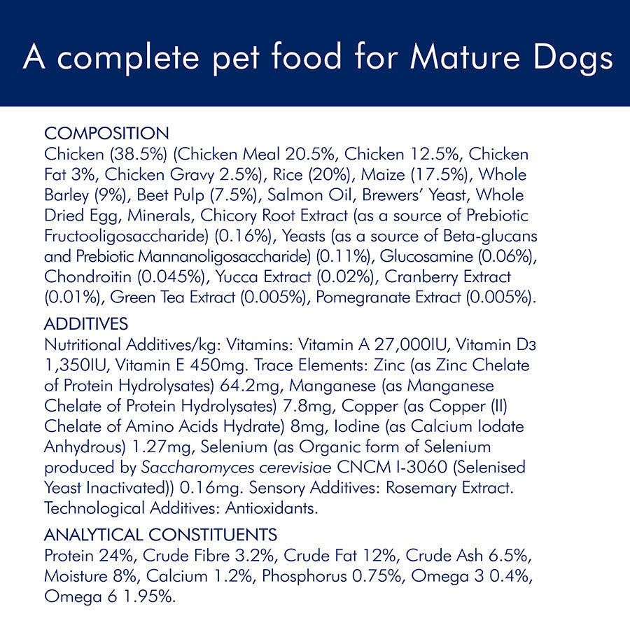 Chicken (38.5%) (Chicken Meal 20.5%, Fresh Chicken 12.5%, Chicken Fat 3%, Chicken Gravy 2.5%), Rice (20%), Maize (17.5%), Whole Barley (9%), Beet Pulp (7.5%), Salmon Oil, Brewers Yeast, Whole Dried Egg, Minerals, Chicory Root Extract (as a source of Pre-biotic Fructooligosaccharide) (0.16%), Yeasts (as a source of Beta-glucans and Pre-biotic Mannanoligosaccharide) (0.11%) Glucosamine (0.06%), Chondroitin (0.045%), Yucca Extract (0.02%), Cranberry Extract (0.01%), Green Tea Extract (0.005%), Pomegranate Extract (0.005%)