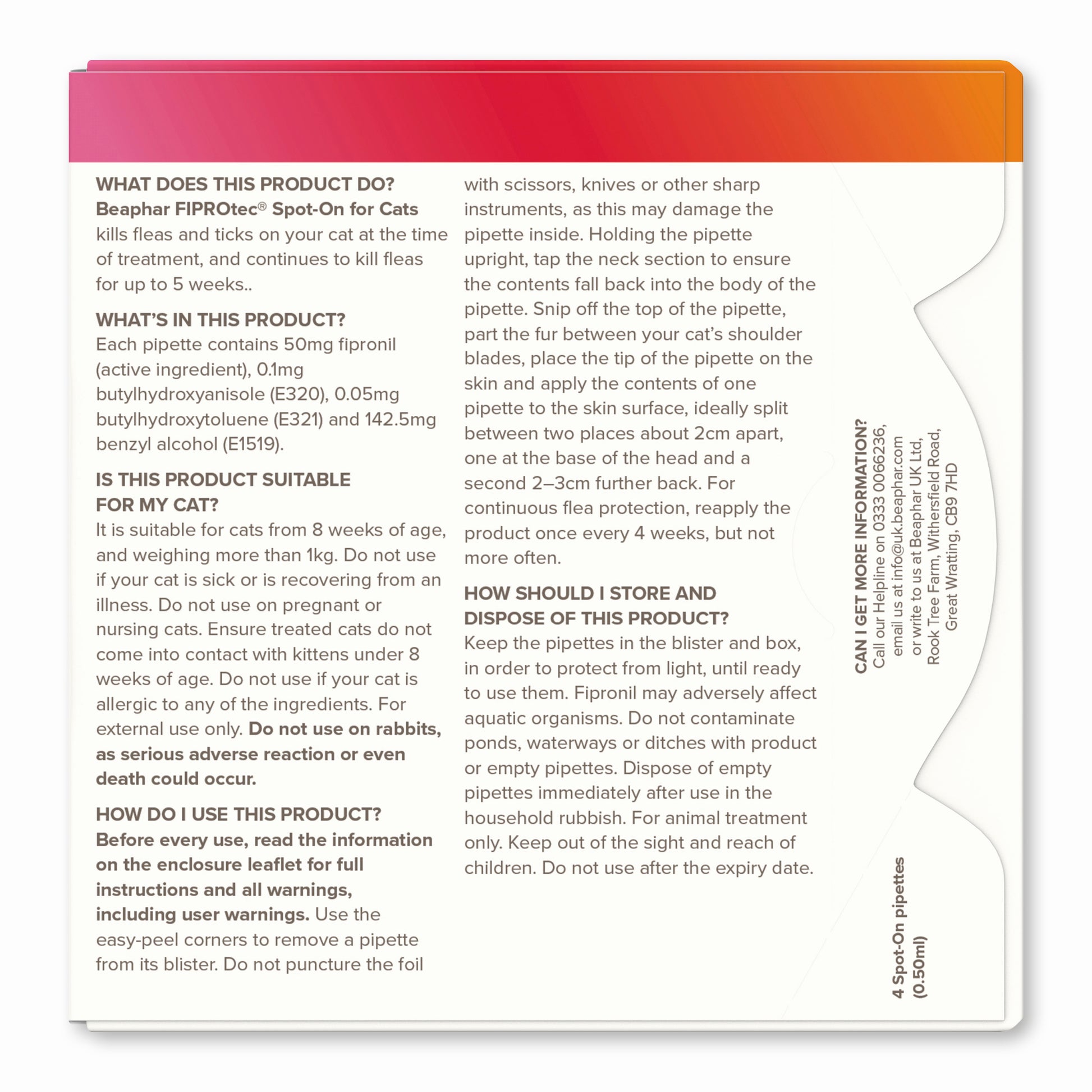 Beaphar FIPROtec Spot-On for Cats is a veterinary medicine, available without prescription, containing fipronil to help control fleas and ticks. It kills fleas for up to five weeks and ticks at the time of treatment. Used routinely Beaphar FIPROtec Spot-On for Cats can help protect your cat from fleas. Treat your cat every 4 weeks for continuous protection against fleas and ticks.