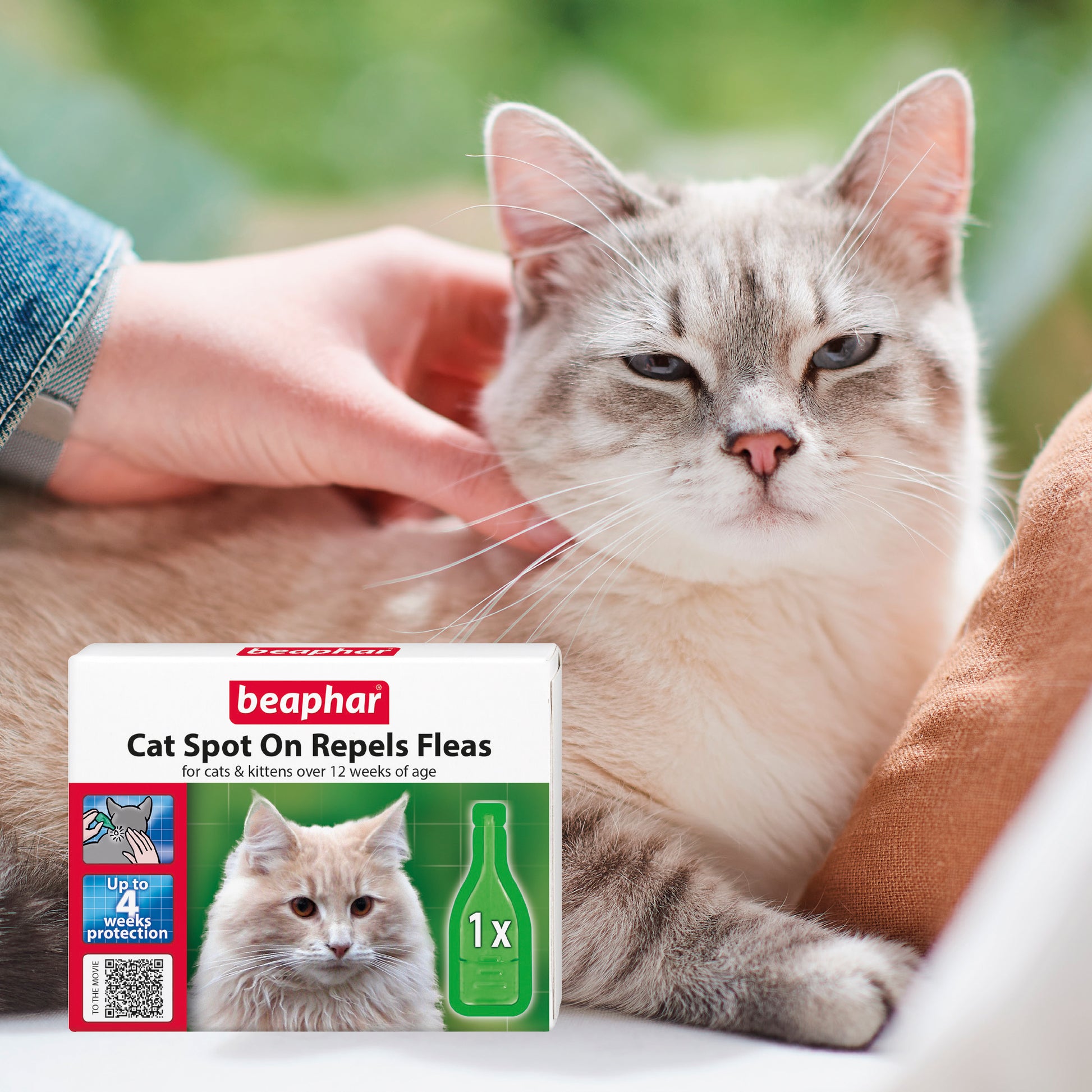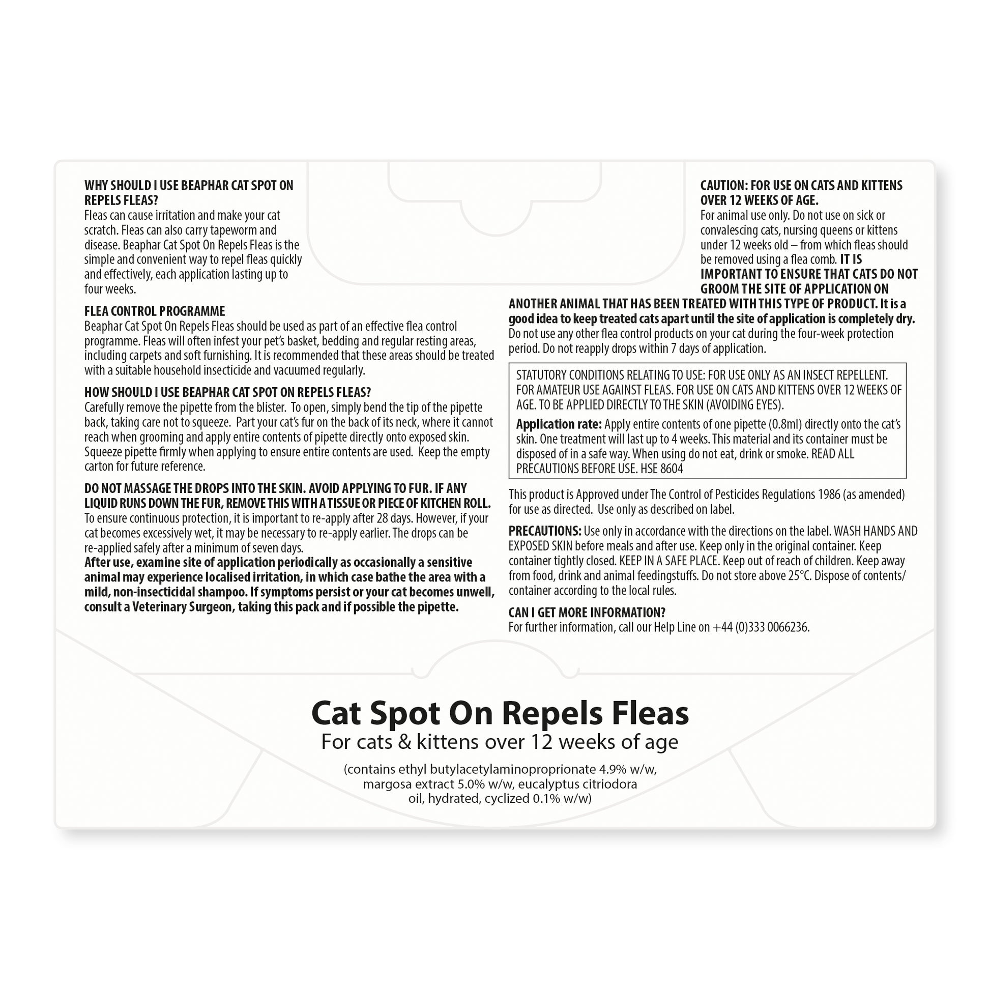Beaphar Flea Spot-On Repellent for Cats contains natural plant extracts including margosa and eucalyptus citriodora oil to repel fleas from cats for up to 4 weeks per application. Beaphar Flea Spot-On for Cats should be used as part of an effective flea control programme. Fleas will often infest the pet’s basket, bedding and regular resting areas, including carpets and soft furnishings. It is recommended that these areas are treated with a suitable household insecticide like Beaphar FLEAtec Household Flea Spray, and vacuumed regularly.