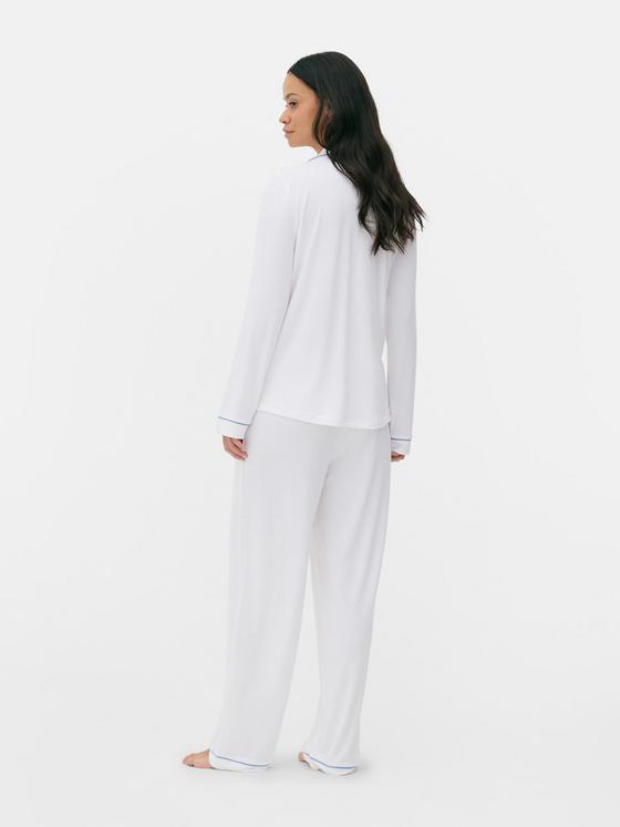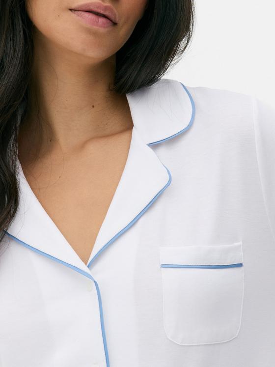 For nightwear that’s as stylish as your daytime wardrobe, you can count on these boyfriend pyjamas in white! Made from a soft jersey, the long sleeve top features a revere collar, button-up front and chest pocket for timeless charm. The coordinating trousers enjoy an elasticated waist that falls to a relaxed wide leg silhouette to offer a comfy wearing experience. Decorated with blue piping, you can layer these white PJs with your fluffiest dressing gown for those moments you want to be extra toasty! Now, where do we add to basket?