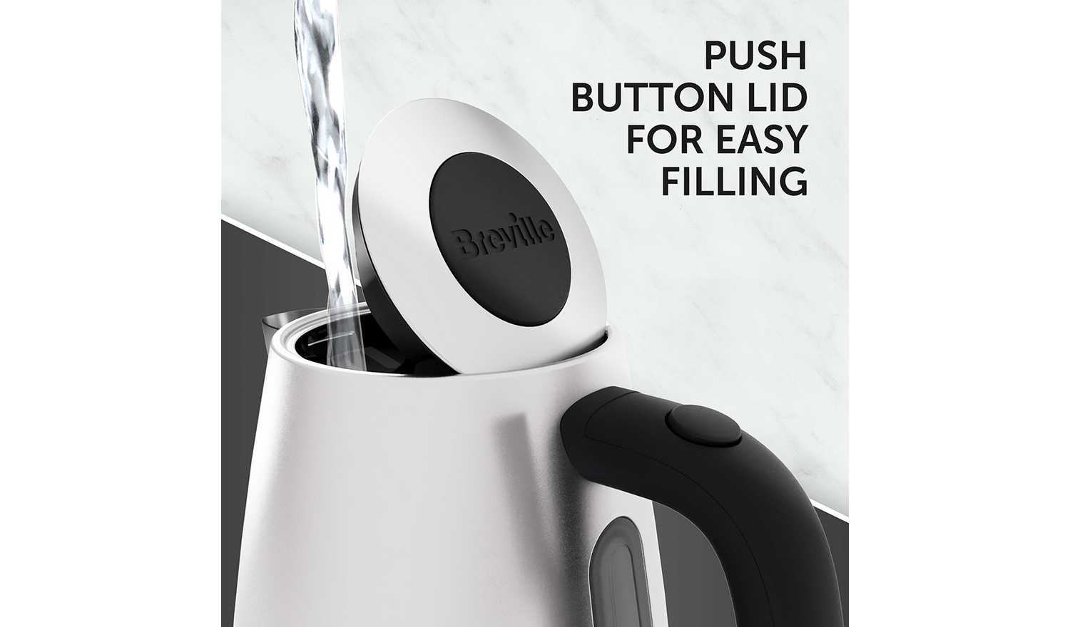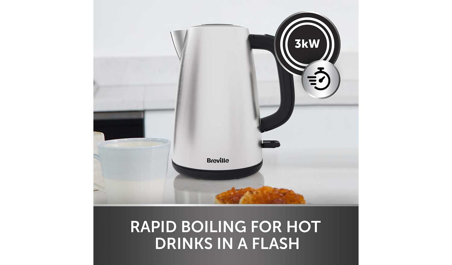 Bring a cool and contemporary feel to your kitchen with this Breville stainless steel kettle. This Breville kettle also handles the basics with ease. The large 1.7L capacity boils up to 8 cups at once with the concealed 3kW element providing a quick boil. Accurate filling is easy thanks to the rear water window, while the 360 degree cordless base is perfect for left and right hand use.