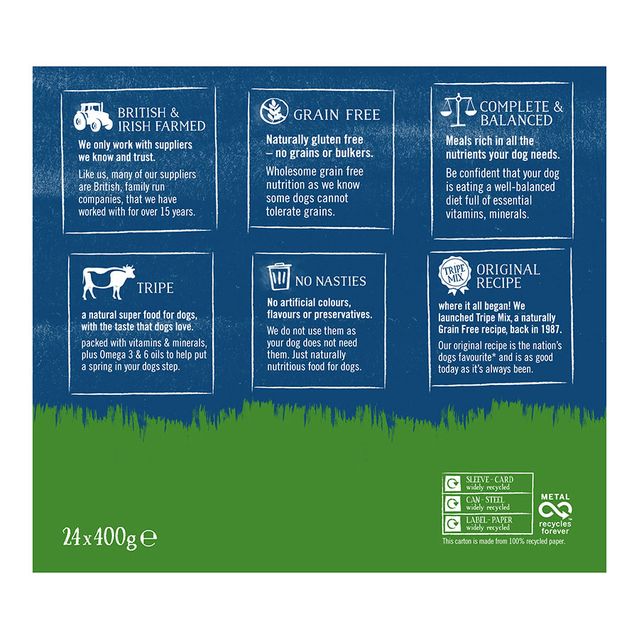 With Tripe: British and Irish Farmed (Chicken 34%, Tripe 13%, Beef 3%), Minerals. With Chicken and Tripe: British and Irish Farmed (Chicken 37%, Tripe 10%, Beef 3%), Minerals. With Beef and Tripe: British and Irish Farmed (Chicken 30%, Beef 10%, Tripe 10%), Minerals