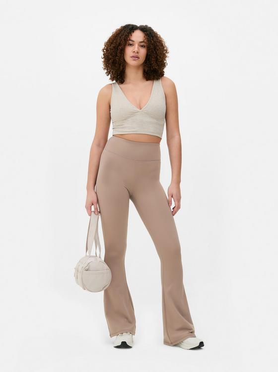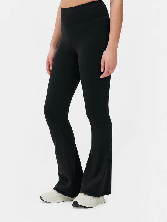 A pair of flared-leg leggings with a thick waistband and added stretch