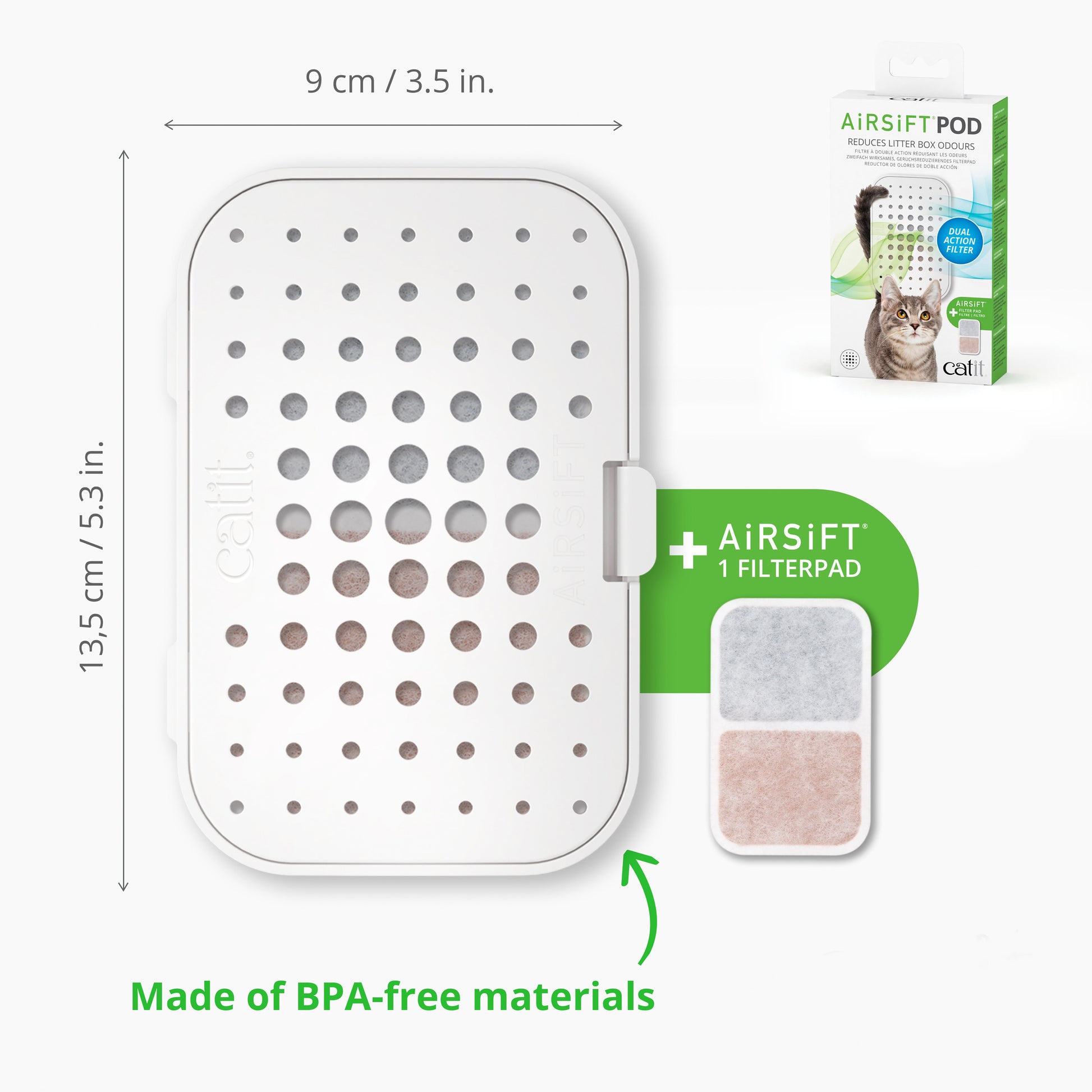 The Catit AiRSiFT Pod perfectly encases the AiRSiFT filter pad, and is designed to work with any hooded litter box.