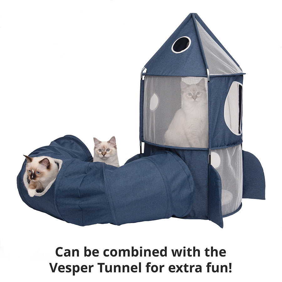 Your cat will be over the moon with this exciting cat tower in the shape of a space rocket. Cats will have hours of fun playing and exploring this 3-level hideout and lounger. One small step for cats, one giant leap for cat-kind. The Catit Vesper Rocket features a comfortable cushion for a well-deserved nap after playtime. It includes a plush ball toy on a string for your cat to swat at.