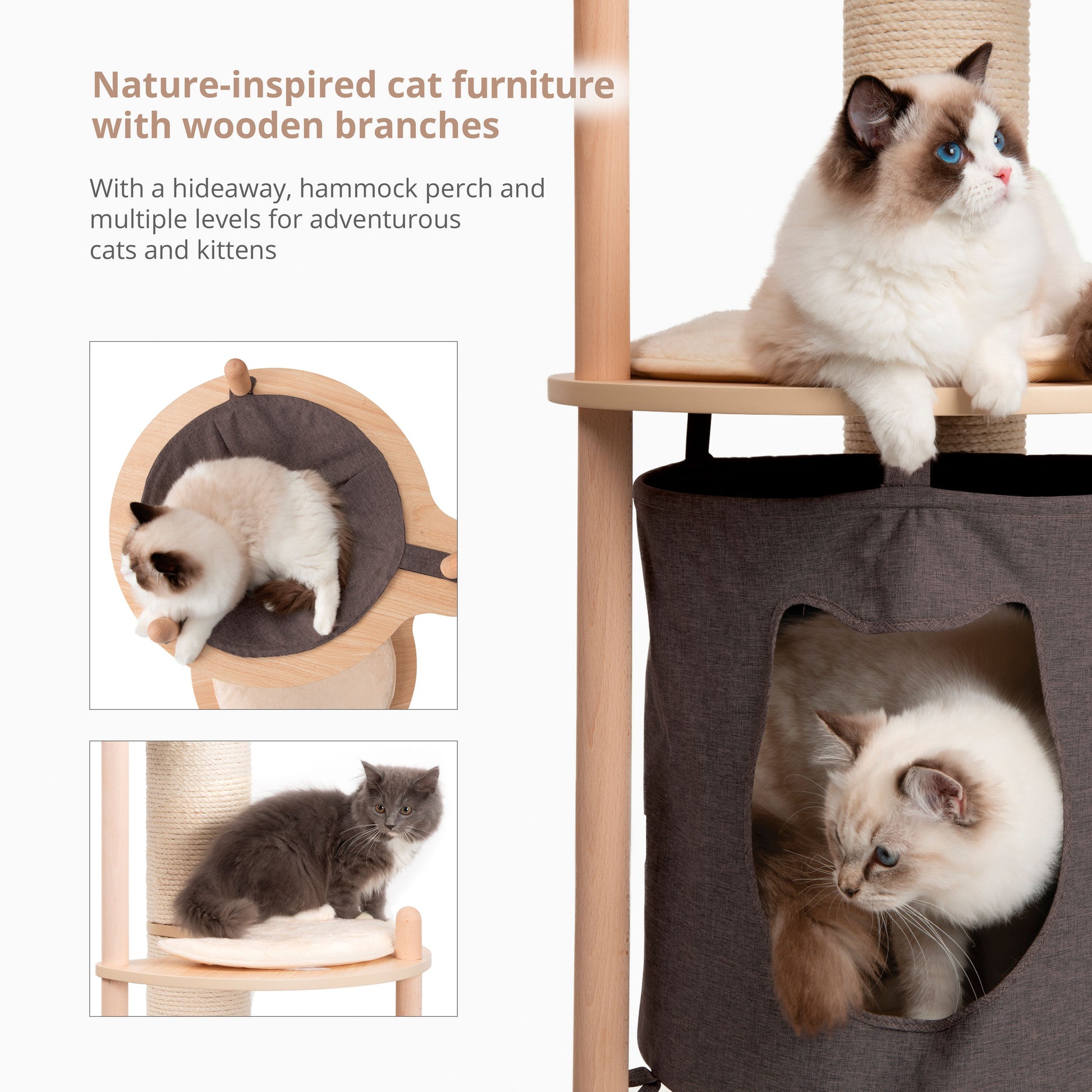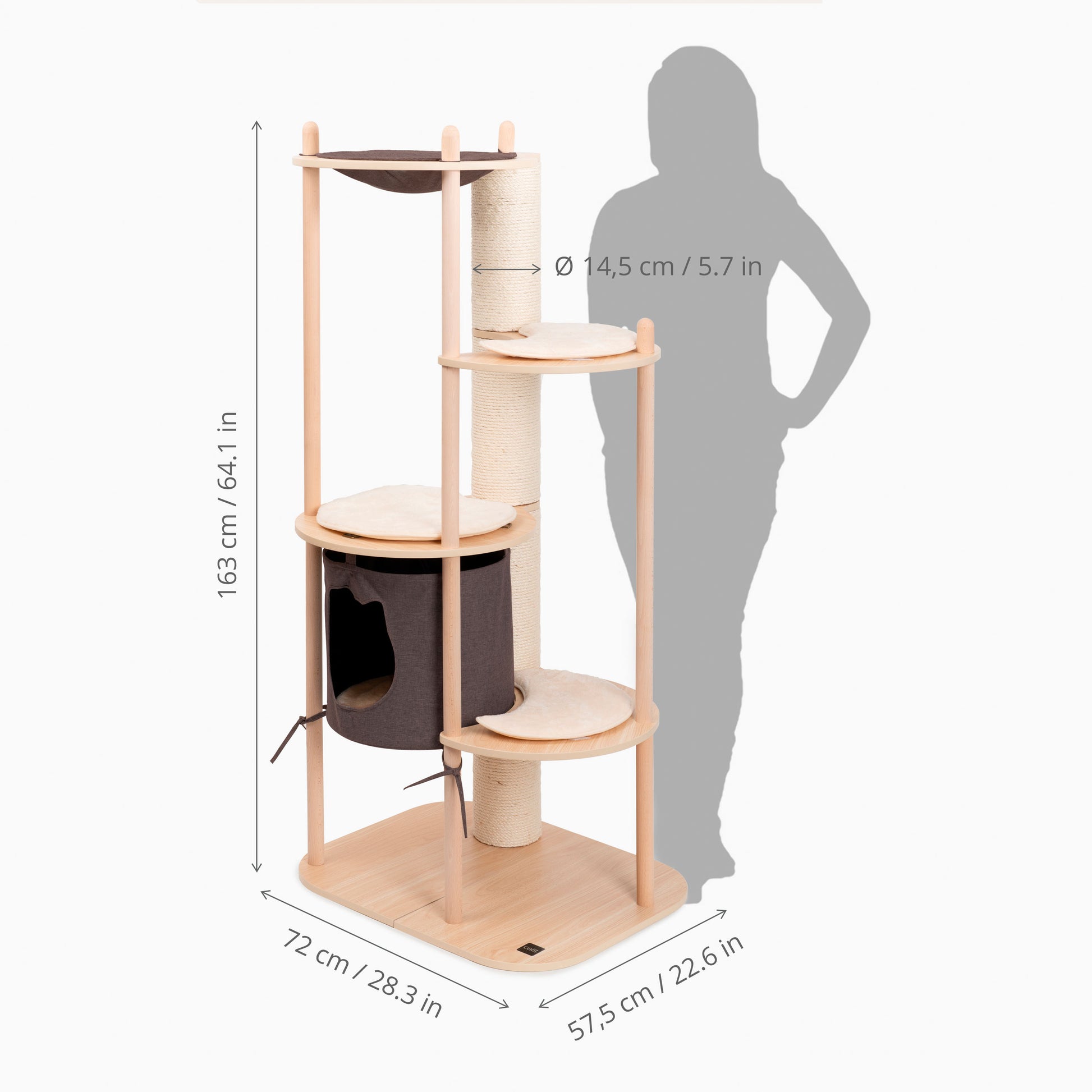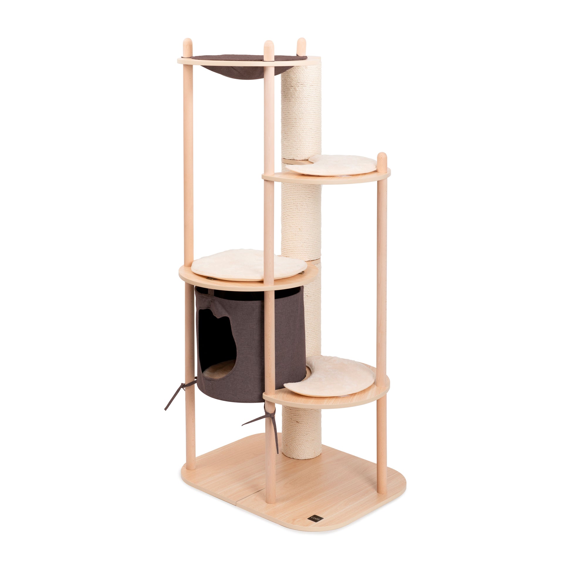 The furniture's elegant wooden poles make up the tree branches, suspending your cat's comfy fabric hideaway and hammock perch. Dressing the branches with a variety of toys is a great way to enrich your cat's playtime. The Treehouse has removable cushions for easy cleaning, and allows you to individually replace any piece that's worn from use.