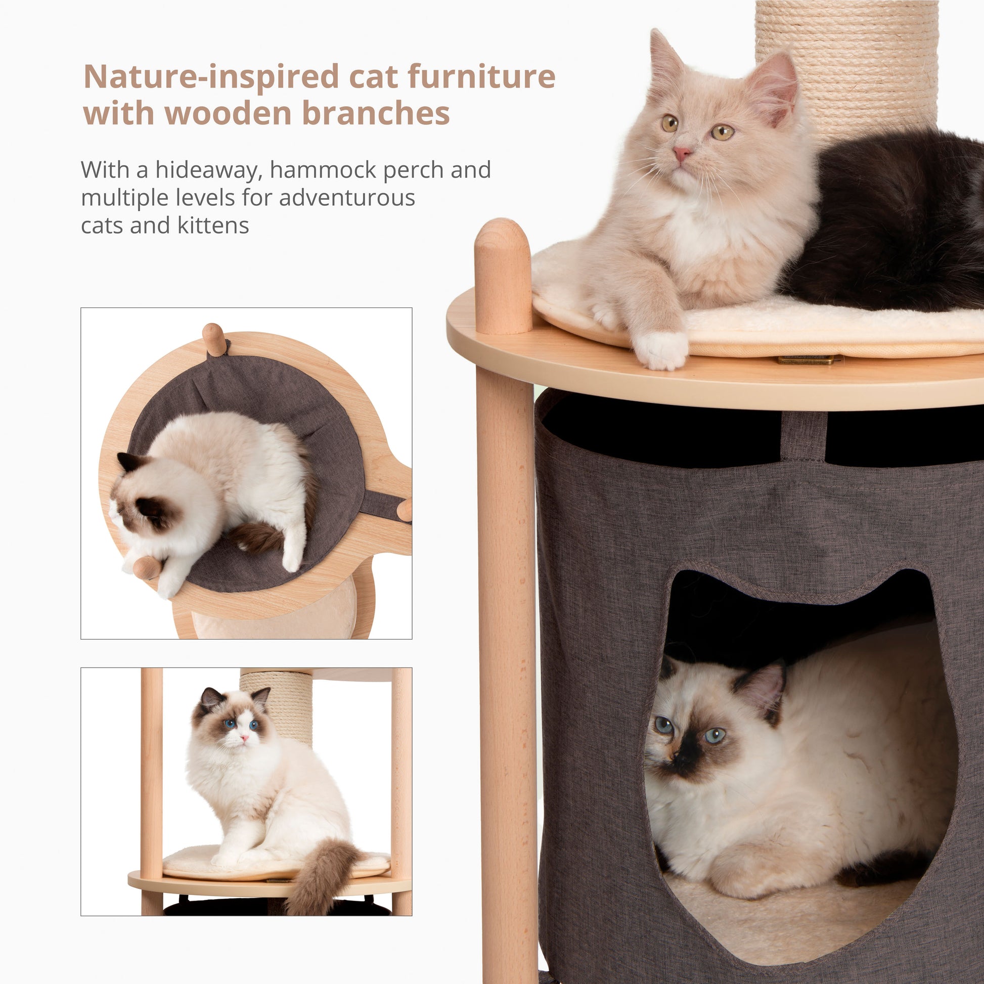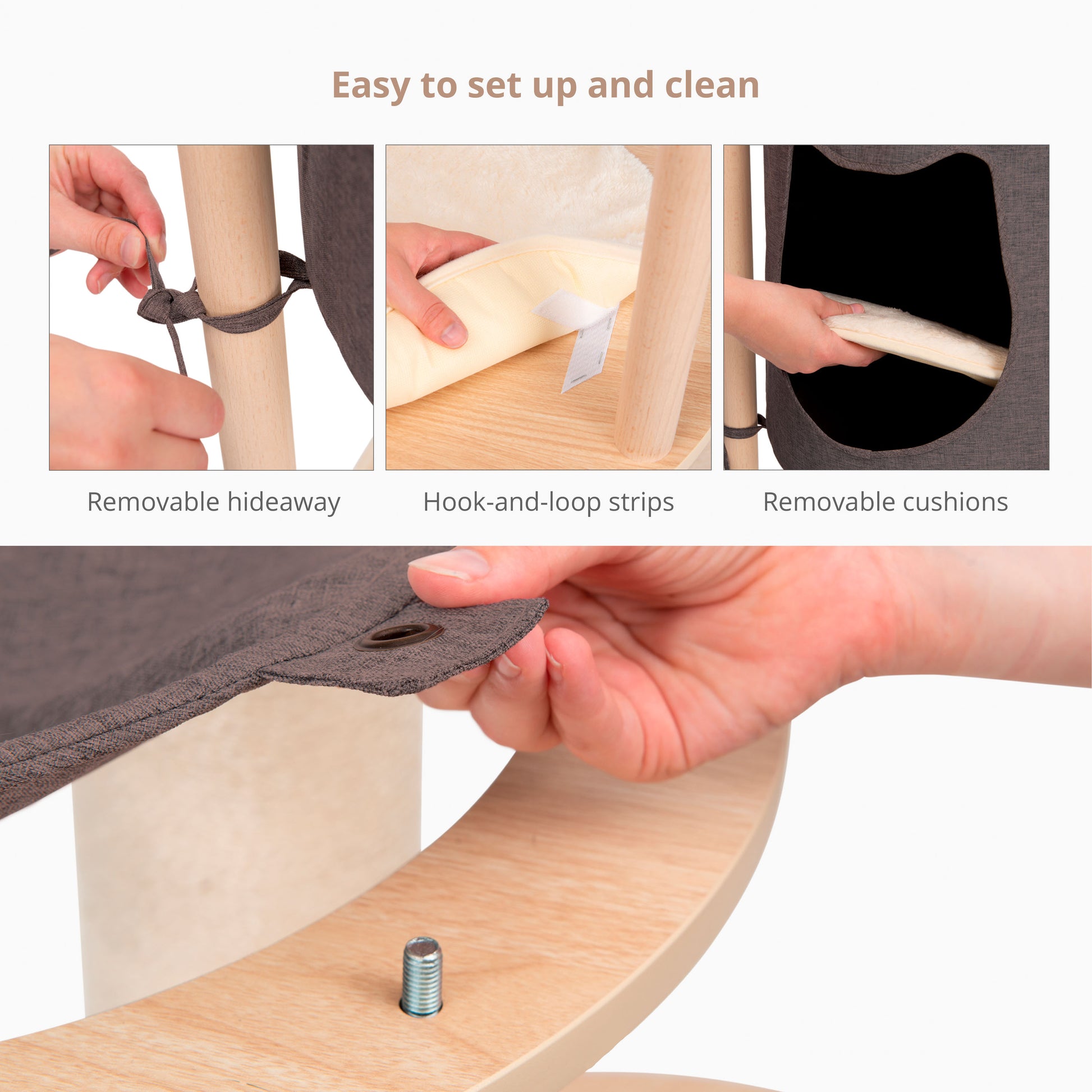 The furniture's elegant wooden poles make up the tree branches, suspending your cat's comfy fabric hideaway and hammock perch. Dressing the branches with a variety of toys is a great way to enrich your cat's playtime. The Treehouse has removable cushions for easy cleaning, and allows you to individually replace any piece that's worn from use.