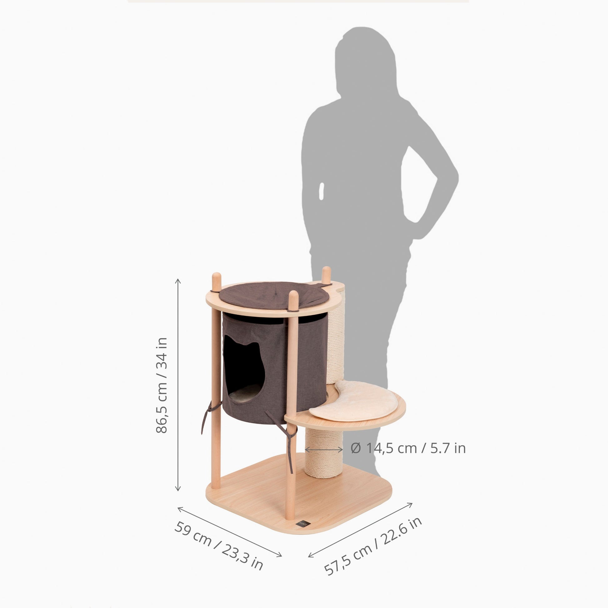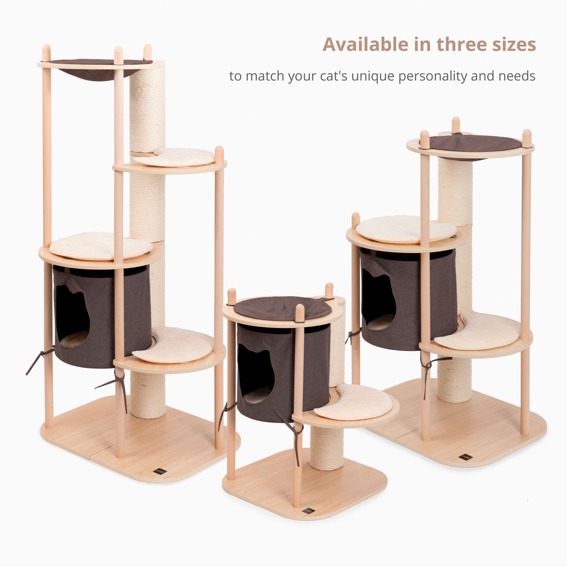 The furniture's elegant wooden poles make up the tree branches, suspending your cat's comfy fabric hideaway and hammock perch. Dressing the branches with a variety of toys is a great way to enrich your cat's playtime. The Treehouse has removable cushions for easy cleaning, and allows you to individually replace any piece that's worn from use.