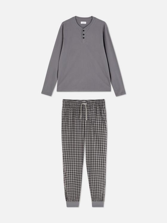 A full-length PJ set, including a button placket top and cuffed bottoms