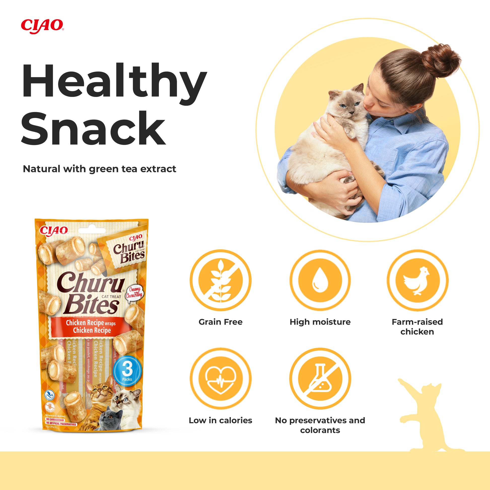 Every Churu Bites product is made with yummy ingredients including chicken. Each pillow-shaped bite starts with a soft baked chicken paste with no grains, preservatives, carrageenan, or artificial colours. They've filled the centres with delicious churu filling to give your cat twice the texture. Each package contains three individually perfectly portioned tubes, which helps keep the tasty treats fresh and helps prevent kitty snaccidents. Even the fussiest of cats will devour these bite-sized treats directly from your hand, even if you've used the creamy centre to sneak a pill into their special snacks. Each piece contains 63% moisture for hydration and about 13 kcal making these a low-calorie treat you can feel good about feeding. They've also added vitamin e for immune system support and green tea extract as an antioxidant.