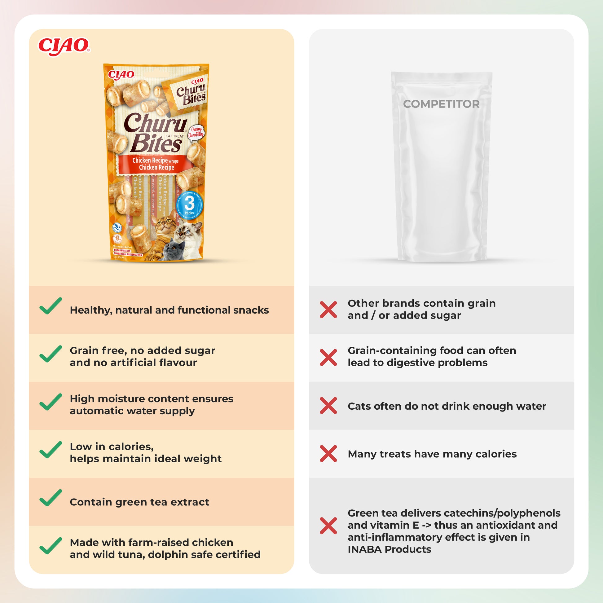 - Twice the texture - Each pillow-shaped bite has a soft baked outer casing and a centre stuffed with delicious Churu filling to give your cat twice the texture.