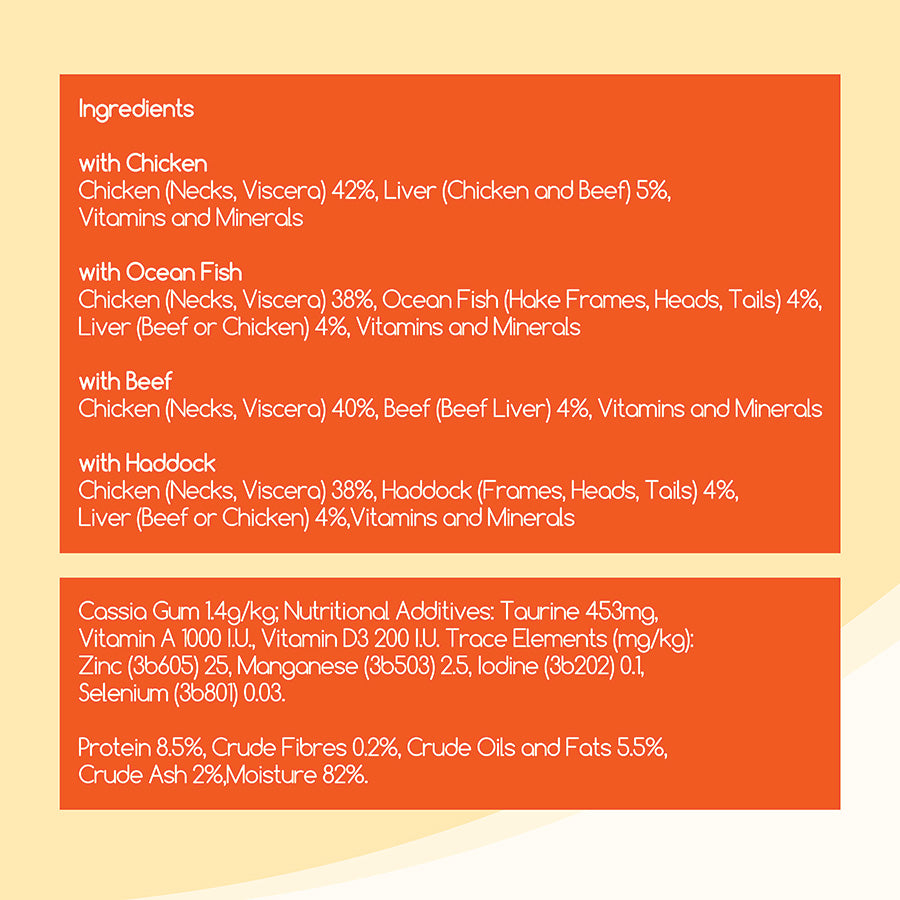 with Beef: Chicken (Necks, Viscera) 40%, Beef (Beef Liver) 4%, Vitamins and Minerals.With Chicken: Chicken (Necks, Viscera) 42%, Liver (Chicken and Beef) 5%,Vitamins and Minerals.With Haddock: Chicken (Necks, Viscera) 38%, Haddock (Frames, Heads, Tails) 4%, Liver (Beef or Chicken) 4%, Vitamins and Minerals.With Ocean Fish: Chicken (Necks, Viscera) 38%, Ocean Fish (Hake Frames, Heads, Tails) 4%, Liver (Beef or Chicken) 4%, Vitamins and Minerals