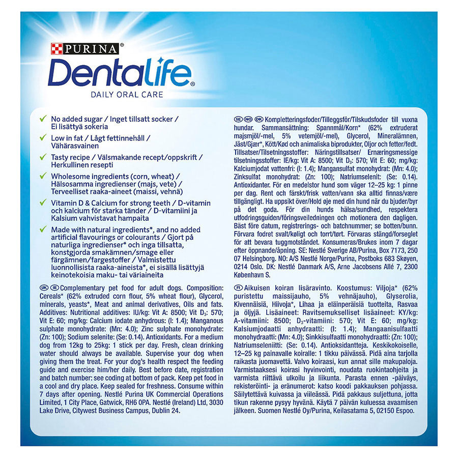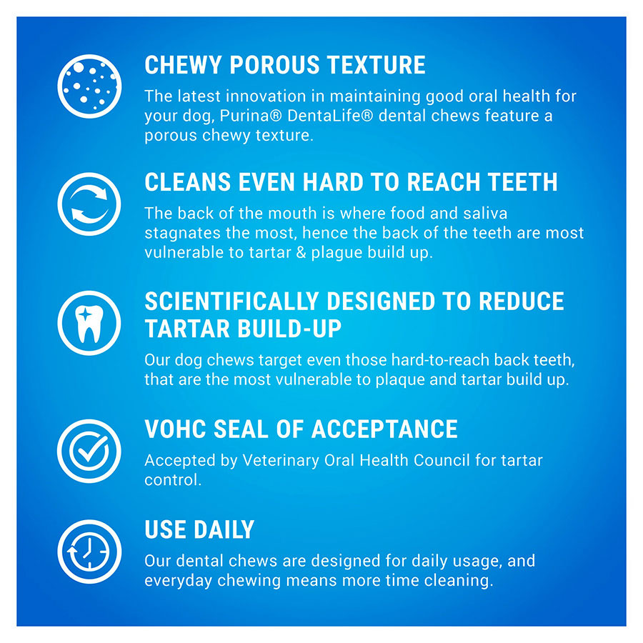 Your dog has specific health needs, and maintaining good oral health contributes positively to his overall well-being. That's why the experts at Purina developed Purina Dentalife, an innovative dental chew that is scientifically proven to help scrub even those hard-to-reach back teeth, that are the most vulnerable to plaque and tartar build up. These dental chews are designed for daily usage, and everyday chewing means more time cleaning.