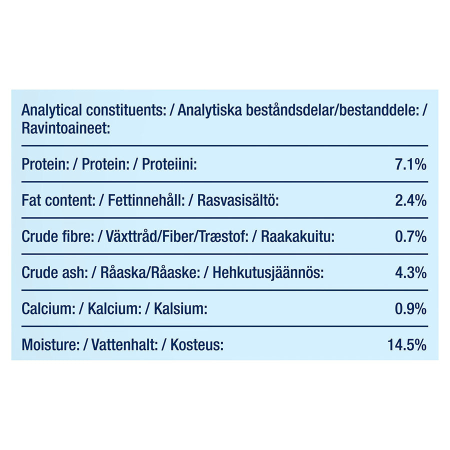 Analytical Constituents: Protein 7.1%, Crude Fibres 0.7%, Crude Oils and Fats 2.4%, Crude Ash 4.3%, Moisture 14.5%, Omega (3 and/or 6) Not stated, Calcium Not stated, Phosphorus Not stated