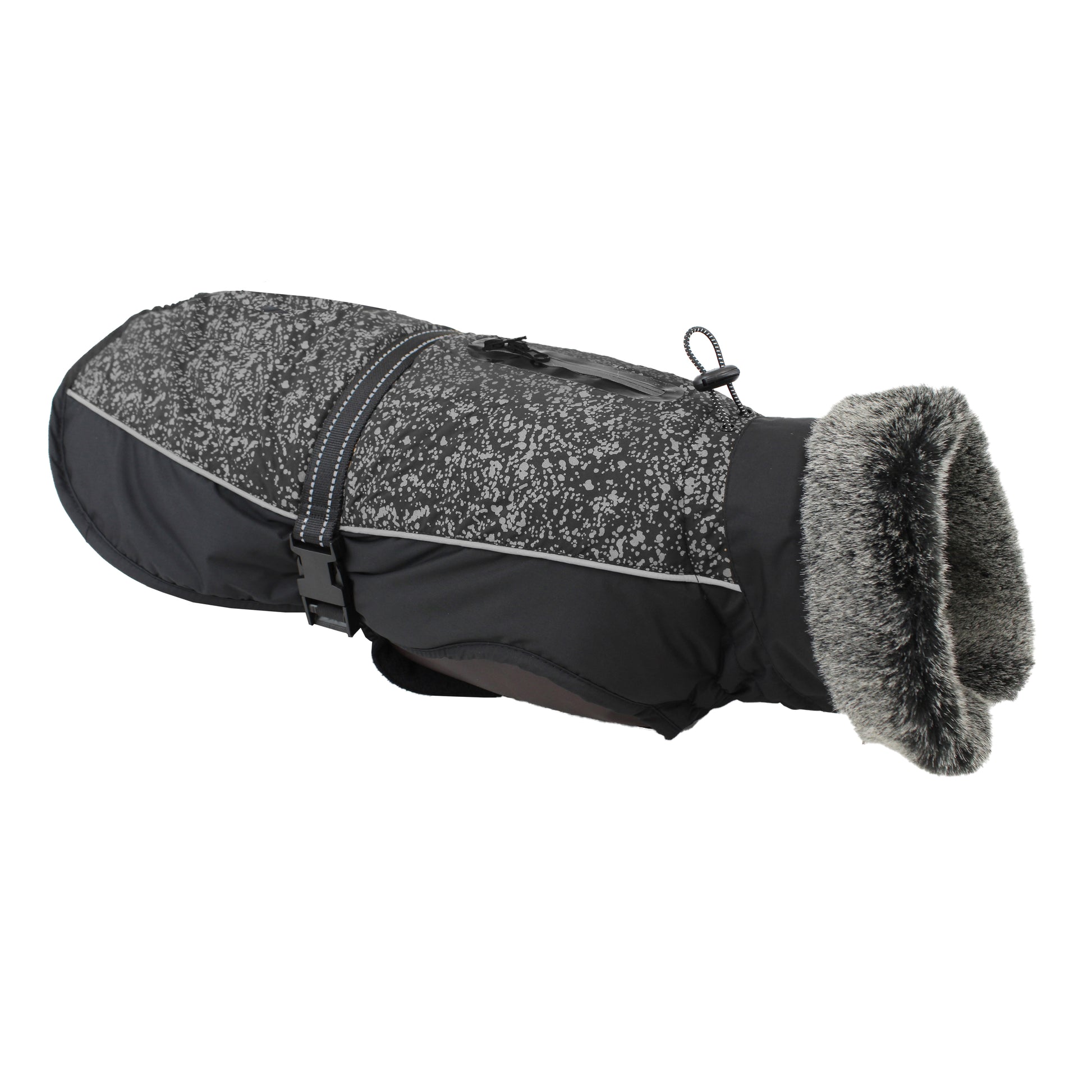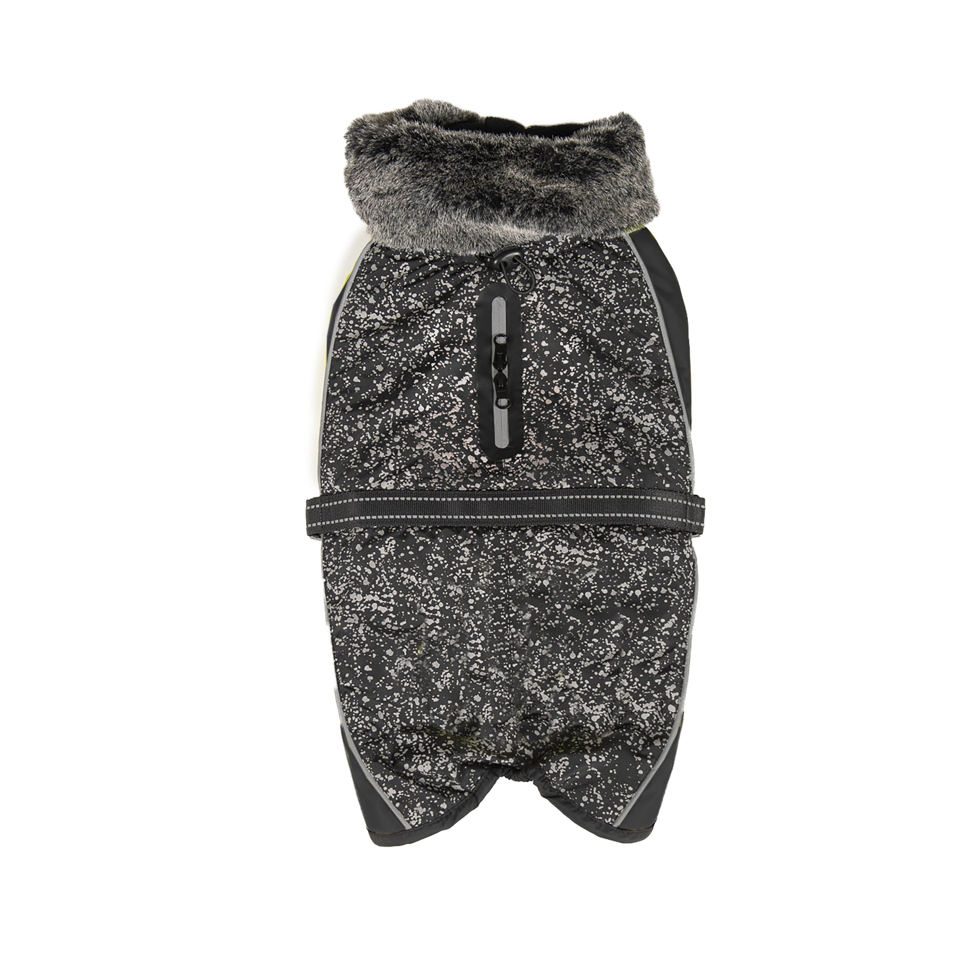 The Aspen Parka provide a level of high style and performance. The Aspen has a wind and waterproof outershell that protects your dog from the harshest elements and a cozy fleece lining and faux fur fur collar that provides extra comfort and warmth. The Repez-It Nano Protection technology makes the fleece liner of these garments liquid and stain resistant which keeps the Aspen looking and smelling cleaner, longer. The Meteor Retro-Reflective technology keeps your dog safer at night by improving visibility to motorists in a pattern that looks great during the day. Dual buckle fasteners and an elastic waist help maintain a snug fit when running or playing.