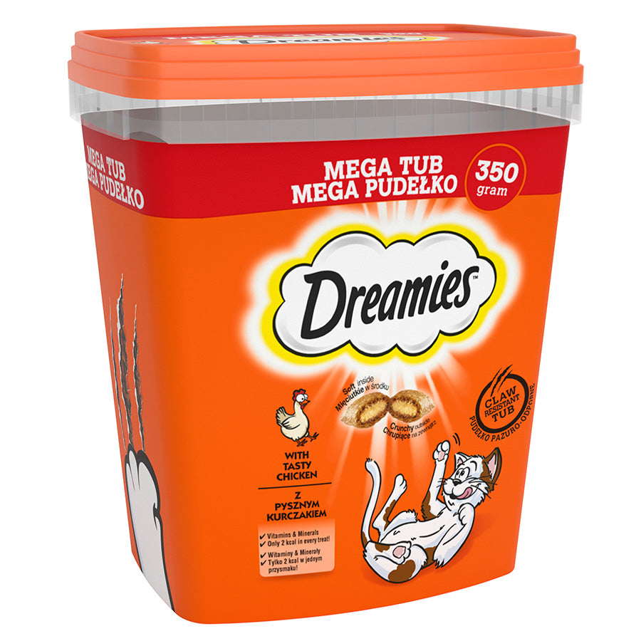 The irresistible combination of a dual texture cat treat and irresistible flavour in Dreamies, means your cats will go mad for the irresistible taste of Dreamies cat treats. With a tasty Chicken flavour containing vitamins and minerals, at just 2 calories per treat. Deliciously crunchy on the outside, soft on the inside; cats simply can't resist the great taste of Dreamies for cats. So go on, give the kibble bag a shake and watch your cat come running for a Dreamie biscuit.