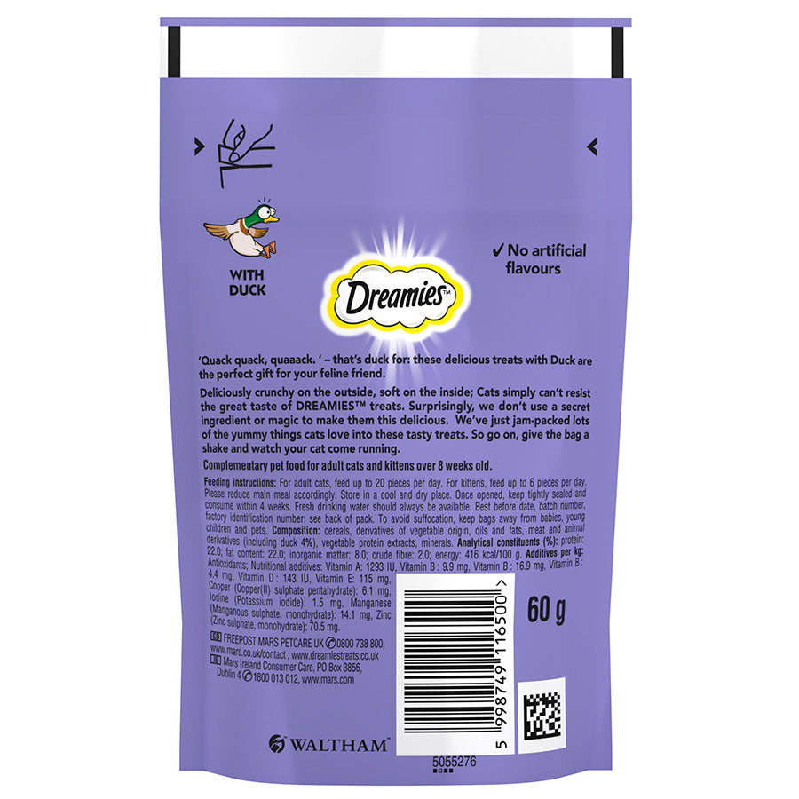 The irresistible combination of a dual texture cat treat and irresistible flavour in Dreamies, means your cats will go mad for the irresistible taste of Dreamies cat treats. With a delicious Duck flavour containing vitamins and minerals, at just 2 calories per treat. Deliciously crunchy on the outside, soft on the inside; cats simply can't resist the great taste of Dreamies for cats. So go on, give the kibble bag a shake and watch your cat come running for a Dreamie biscuit.