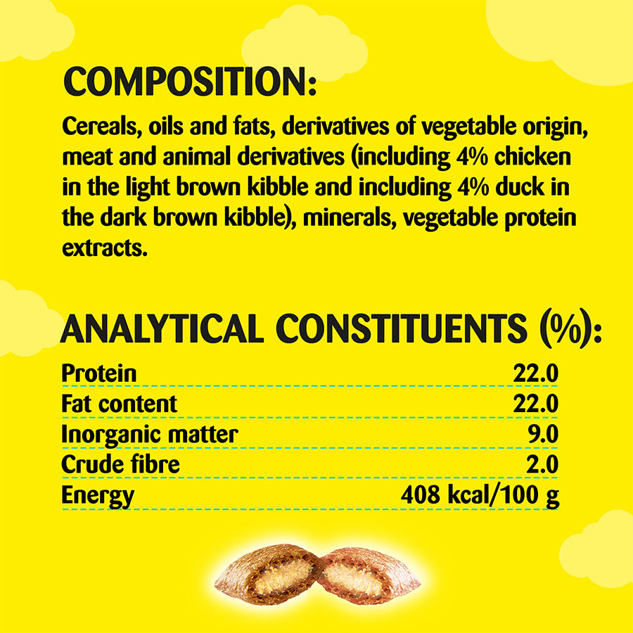 with chicken and duck cereals, derivatives of vegetable origin, oils and fats, meat and animal derivatives (including chicken 4% in the light brown kibble and duck 4% in the dark brown kibble), vegetable protein extracts, minerals.