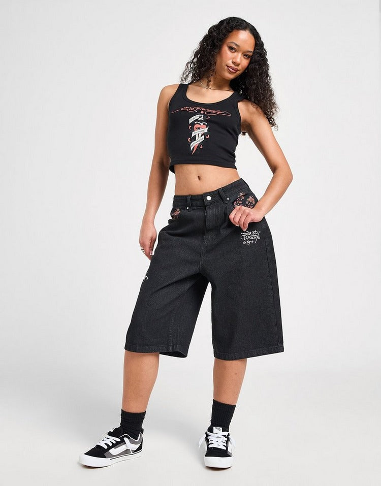 Go bold this Summer in these women's Dragon Denim Jorts from Ed Hardy. Offering a roomy fit with a mid-rise, wide-leg silhouette, these jorts are cut from durable denim cotton fabric for lasting comfort. They feature a button fastening and simple fly, while front and back pockets add room to stash your essentials. Coming in a washed Black colourway, they're finished off with Ed Hardy branding across the rear and a dragon print to the right leg. Machine washable. | Our model is 5'8" and wears a size small.