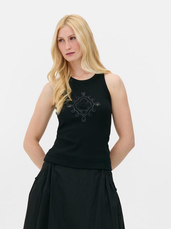 A racer back vest featuring embroidered design to the front
