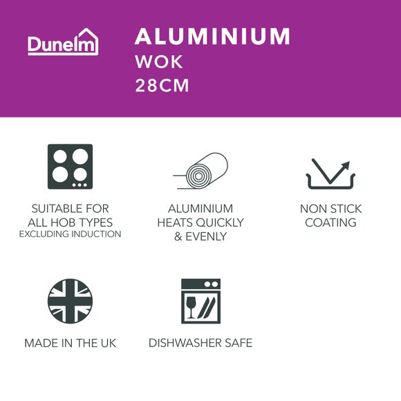 Suitable for all hob types except induction, this 28 wok has been crafted from aluminium for added longevity and is dishwasher safe for ease of cleaning. Complete with a durable Teflon coating this wok is perfect for cooking stir fry, noodle dishes and much more.