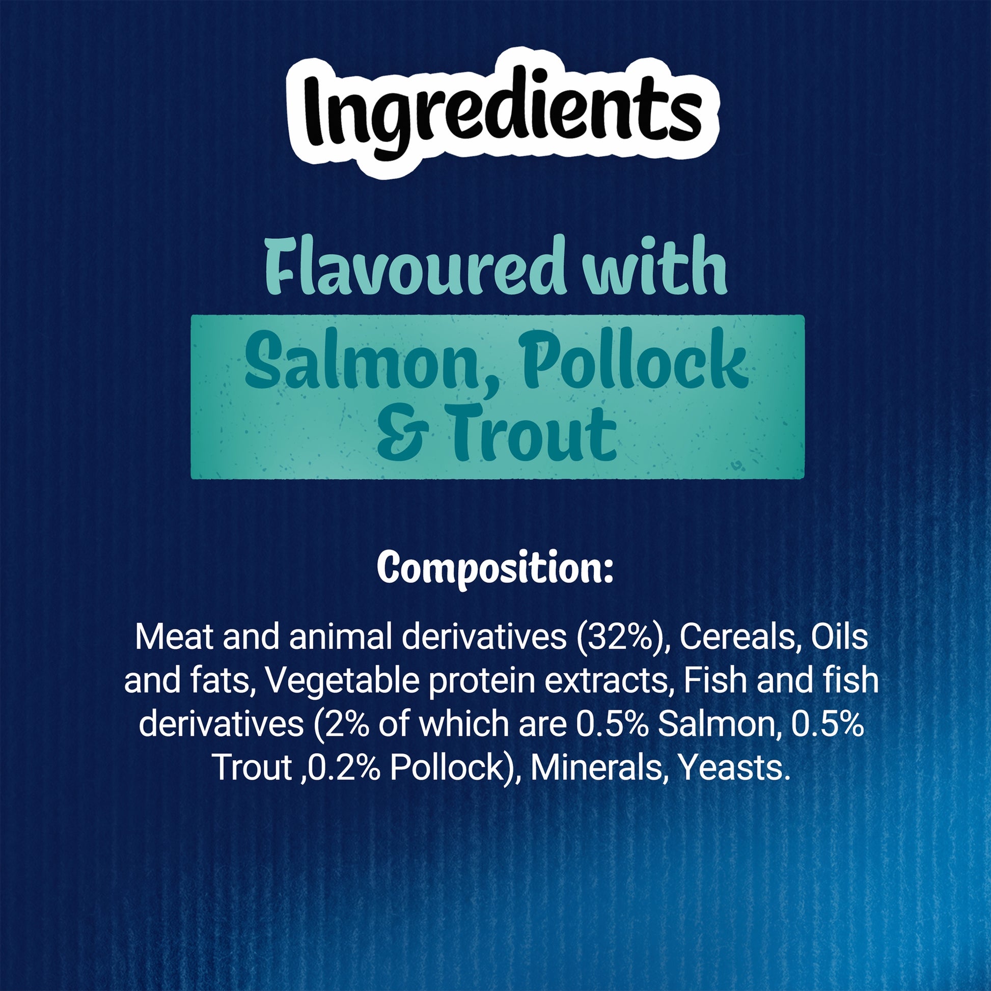 Meat and animal derivatives (32%), Cereals, Oils and fats, Vegetable protein extracts, Fish and fish derivatives (2% of which are 0.5% Salmon, 0.5% Trout, 0.2% Pollock), minerals, yeasts.
