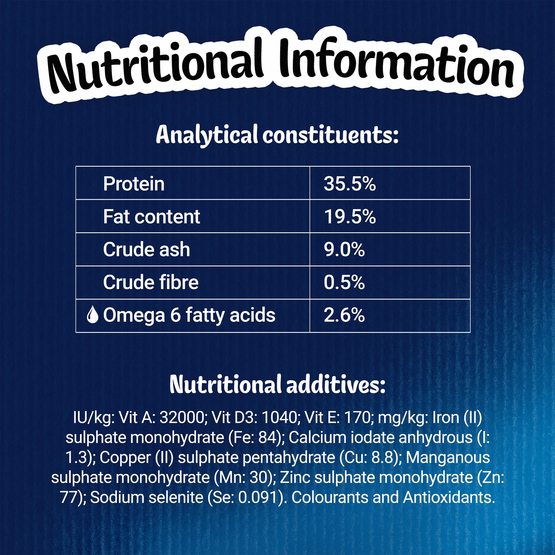 Analytical Constituents: Protein 35.5%, Crude Fibres 0.5%, Crude Oils and Fats 19.5%, Crude Ash 9%, Moisture Not stated, Omega (3 and / or 6) 2.6% Calcium Not stated, Phosphorus Not stated