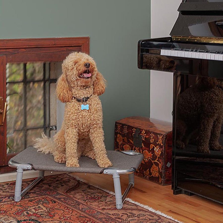 Your pets will have sweeter naps on Dream, the folding dog bed, with its thick cover and super-resistant aluminium frame. It is perfect for your furry friend to sleep on, on a porch, in a garage or in his own room. This dog bed has folding legs that help to keep it raised off the ground and it can be put away easily when it is not being used. Spare covers are available, as well as the replaceable elastic cords that keep the cover taut at all times. 100% Nylon Fabric, Aluminium Frame.