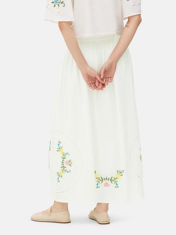 Sunny days are calling your name with this white midi skirt with floral embroidery