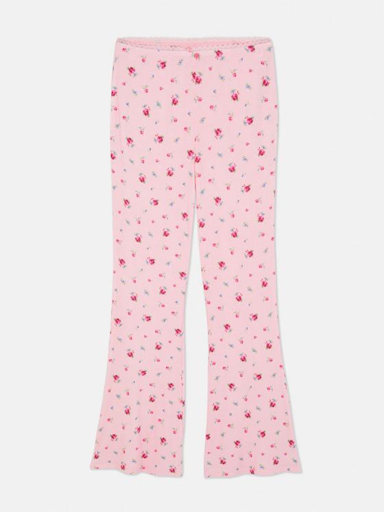 A pair of full-length pyjama bottoms made from a stretchy woven fabric and finished with a floral print and ribbed texture