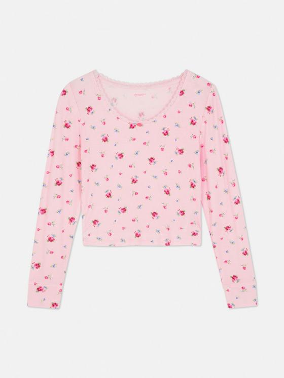 A long-sleeved floral PJ top in a rib fabric with a lace neckline