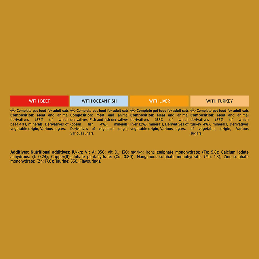 You'll enjoy feeding your cat delicious, high quality recipes made with thoughtfully selected ingredients cooked with care for exquisite flavour, to delight the refined tastes of your feline foodie. Gourmet has a wide variety of delicious recipes to spoil your cat's sophisticated palate with a different taste experience everyday.