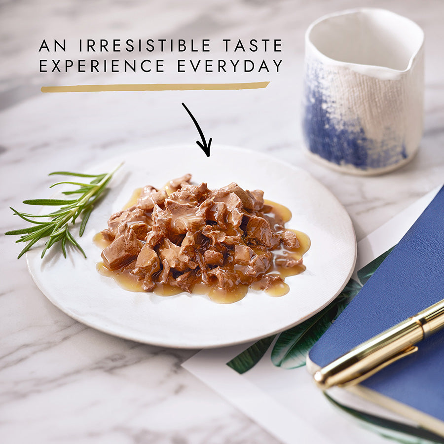 Our Chef's Collection Value Pack contains four tempting recipes: one made with tender turkey, one with delicate tuna, one with savoury duck, and one with delicious, meaty lamb. Each one is served in a delectable savoury gravy for a mealtime experience your discerning feline companion will love. Each meal provides complete and balanced nutrition, too, so your cat will feel as good as they look - without compromising on the luxurious taste they love and deserve. A range of nutritionally complete and balanced meals.