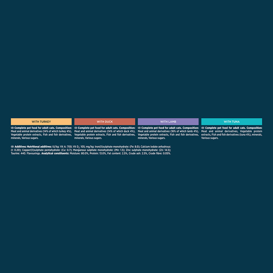 Meat and animal derivatives (minimum 4% duck/turkey/lamb), vegetable protein extracts, fish and fish derivatives (of which tuna minimum 4%), molluscs and crustaceans (whole shrimp minimum 4%), minerals, various sugars