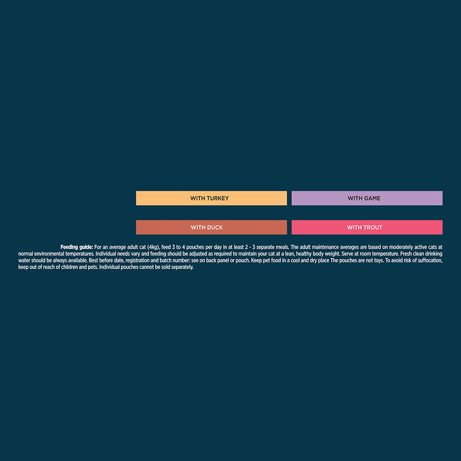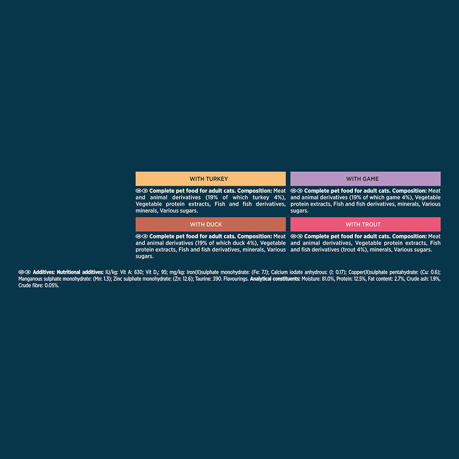 Turkey: Meat and animal derivatives (of which turkey 4%); vegetable protein extracts; fish and fish derivatives; minerals; various sugars.<br />Trout: Meat and animal derivatives; vegetable protein extracts; fish and fish derivatives (of which trout 4%); minerals; various sugars.<br />Duck: Meat and animal derivatives (of which duck 4%); vegetable protein extracts; fish and fish derivatives; minerals; various sugars.<br />Game: Meat and animal derivatives (of which game 4%); vegetable protein extracts; fish and fish derivatives; minerals; various sugars.