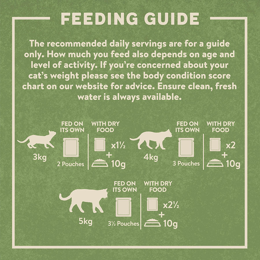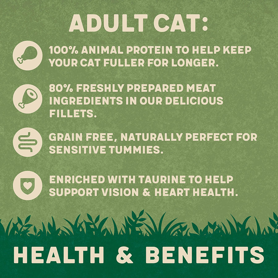Their wet cat food contains delicious meaty fillets, packed with 80% freshly prepared meat ingredients. They don't add unnecessary vegetable protein neither, which means their complete cat food contains 100% animal protein, the ideal source of essential amino acids for cats. They don't use generic meat and animal derivatives, instead they use freshly prepared meat ingredients which are gently cooked to ensure the protein is highly digestible. Their grain free cat food is also formulated without any cereals or fillers, as cats get all the energy they need from meat. That means it's purr-fect for sensitive tummies too.
