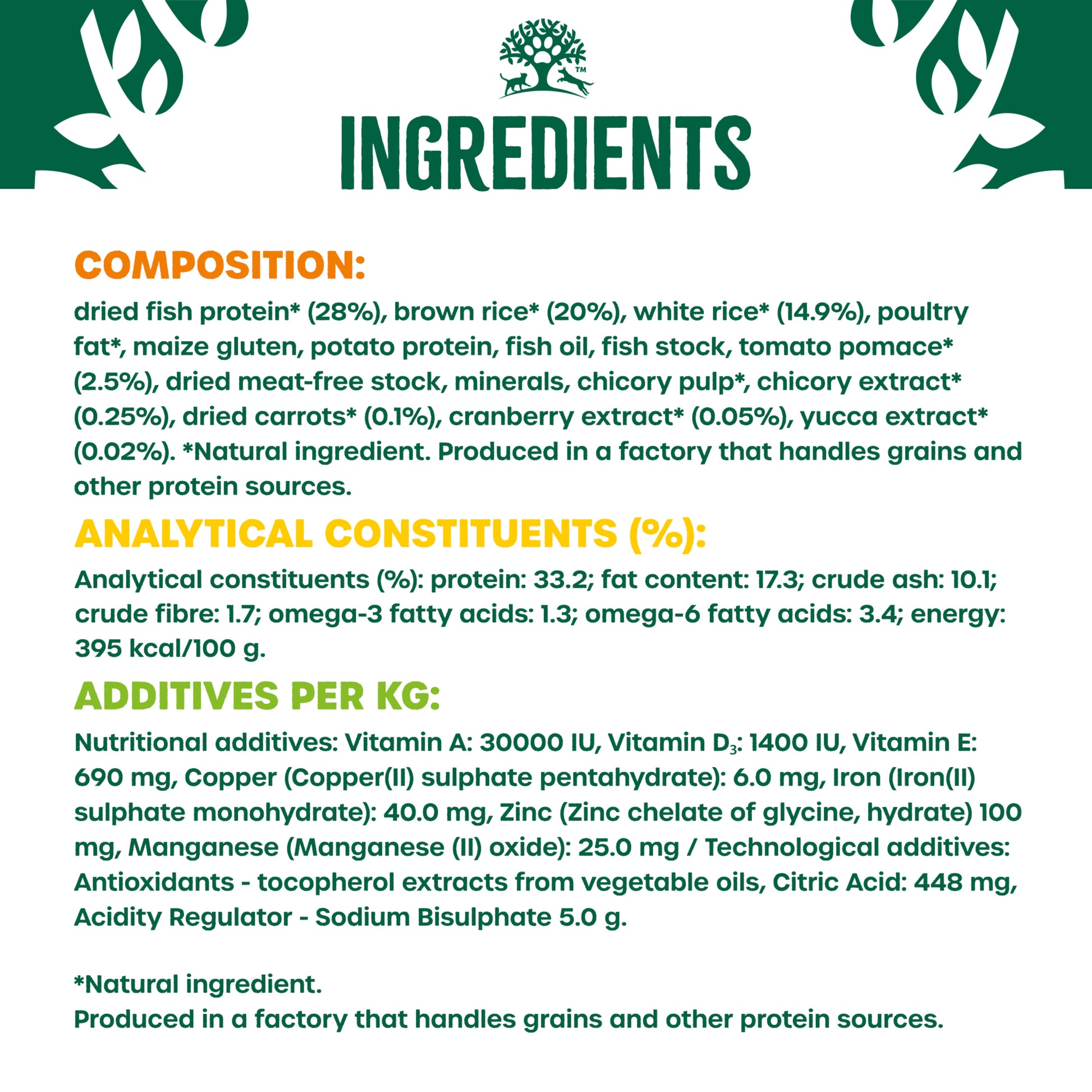 Dried Fish Protein* (28%), Brown Rice* (20%), White Rice* (14.9%), Poultry Fat*, Maize Gluten, Potato Protein, Fish Oil, Fish Stock, Tomato Pomace* (2.5%), Dried Meat-Free Stock, Minerals, Chicory Pulp*, Chicory Extract* (0.25%), Dried Carrots* (0.1%), Cranberry Extract* (0.05%), Yucca Extract* (0.02%). *Natural Ingredient.