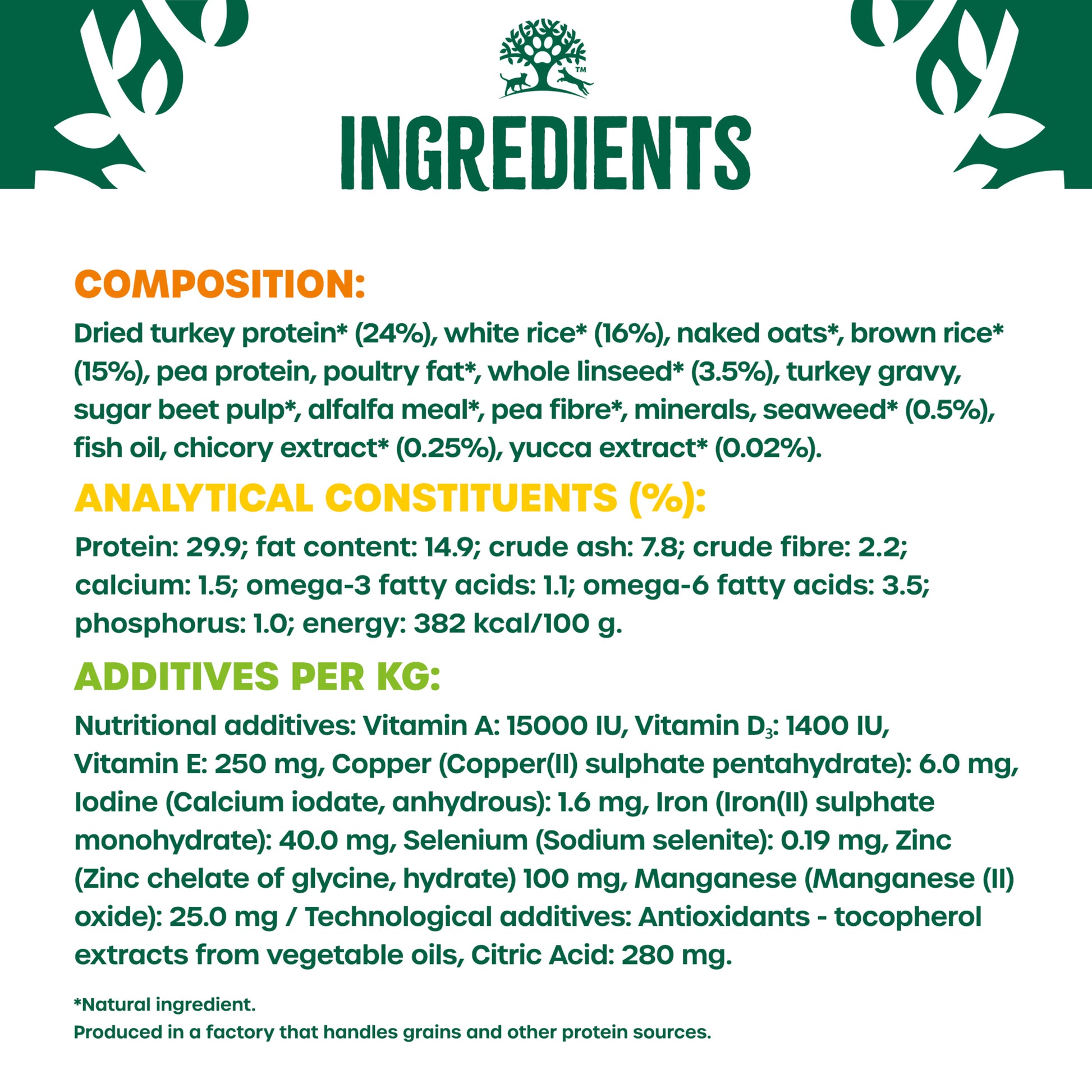 Dried Turkey Protein* (24%), White Rice* (16%), Naked Oats*, Brown Rice* (15%), Pea Protein, Poultry Fat*, Whole Linseed* (3.5%), Turkey Gravy, Sugar Beet Pulp*, Alfalfa Meal*, Pea Fibre*, Minerals, Seaweed* (0.5%), Fish Oil, Chicory Extract* (0.25%), Yucca Extract* (0.02%). *Natural Ingredient.