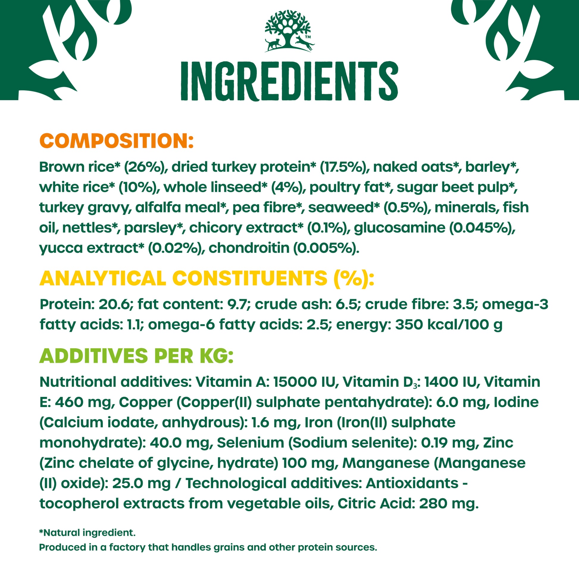 Brown Rice* (26%), Dried Turkey Protein* (17.5%), Naked Oats*, Barley*, White Rice* (10%), Whole Linseed* (4%), Poultry Fat*, Sugar Beet Pulp*, Turkey Gravy, Alfalfa Meal*, Pea Fibre*, Seaweed* (0.5%), Minerals, Fish Oil, Nettles*, Parsley*, Chicory Extract* (0.1%), Glucosamine (0.045%), Yucca Extract* (0.02%), Chondroitin (0.005%). *Natural Ingredient.