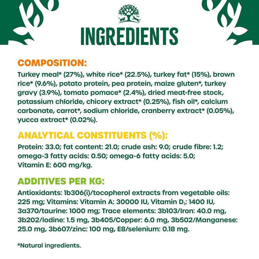 Turkey meal (27%), white rice, turkey fat (15%), brown rice, potato protein, pea protein, maize gluten, turkey gravy (3.9%), tomato pomace, dried meat-free stock, potassium chloride, chicory extract (0.25%), fish oil, calcium carbonate, carrot, sodium chloride, cranberry extract (0.05%), yucca extract (0.02%), rosemary extract (0.006%), green tea extract (0.002%)