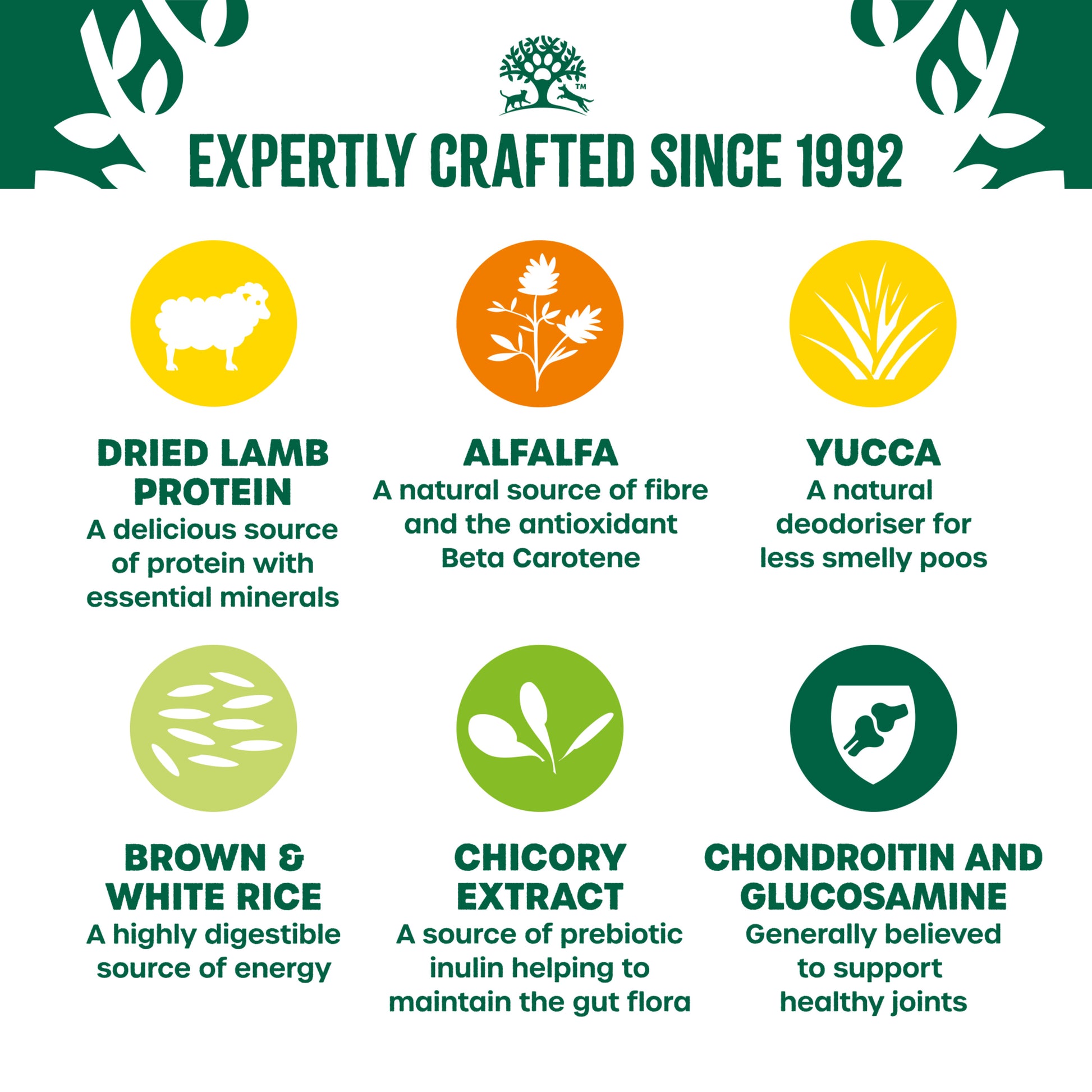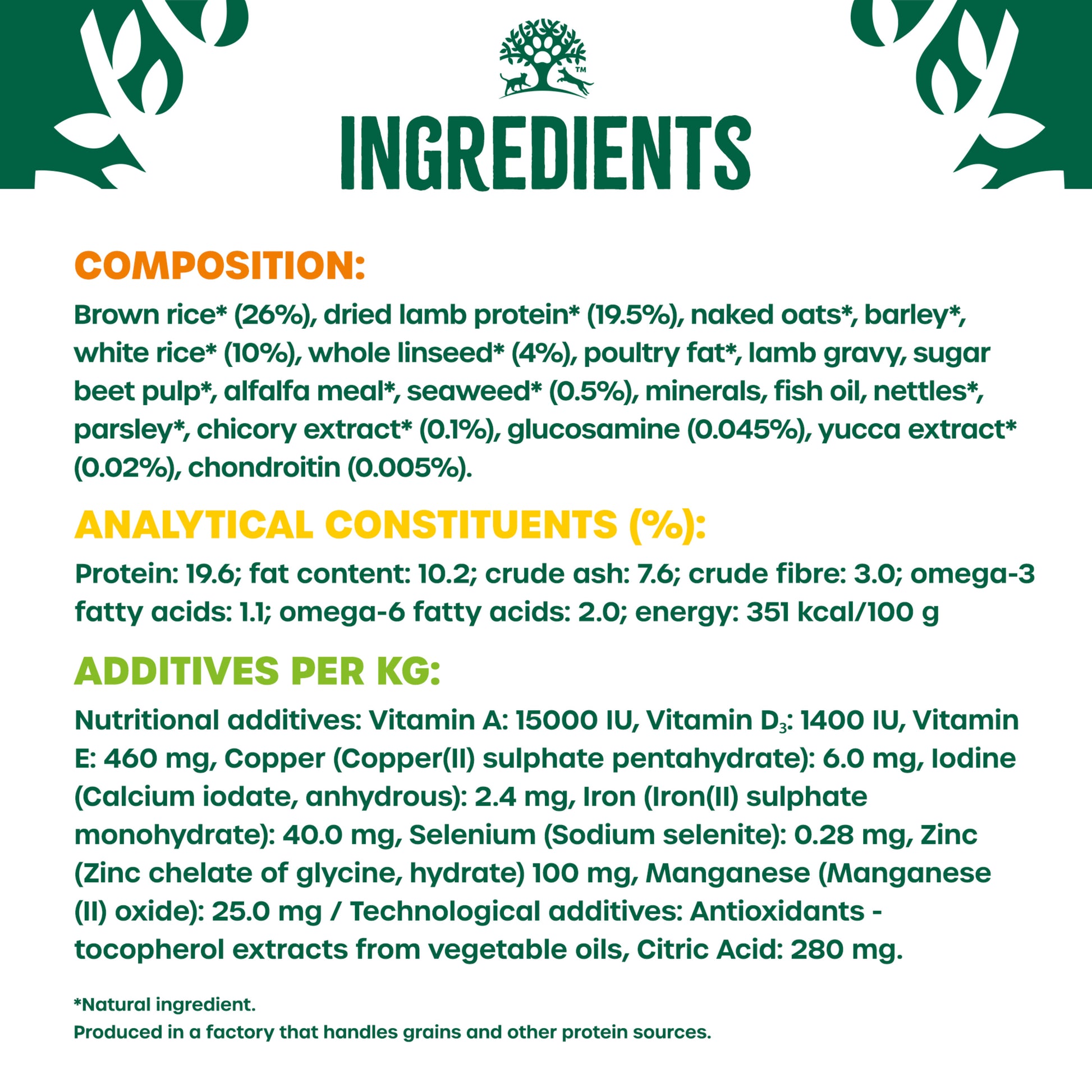 Brown Rice* (26%), Dried Lamb Protein* (19.5%), Naked Oats*, Barley*, White Rice* (10%), Whole Linseed* (4%), Poultry Fat*, Lamb Gravy, Sugar Beet Pulp*, Alfalfa Meal*, Seaweed* (0.5%), Minerals, Fish Oil, Nettles*, Parsley*, Chicory Extract* (0.1%), Glucosamine (0.045%), Yucca Extract* (0.02%), Chondroitin (0.005%). *Natural Ingredient.
