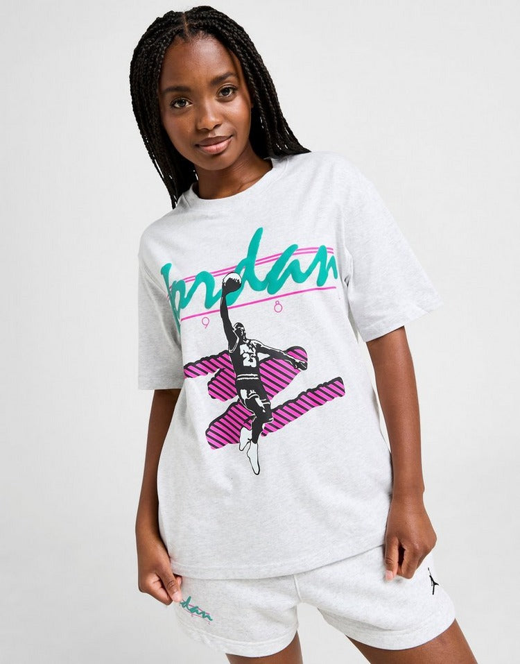 Bring a retro vibe with this women's MVP Graphic T-Shirt from Jordan. In a Birch Heather colourway, this standard-fit tee is cut from soft cotton fabric for everyday comfort. It features short sleeves with a ribbed crew neckline and is finished up with graphic branding to the chest. Machine washable | Our model is 5'7" and wears a size S.