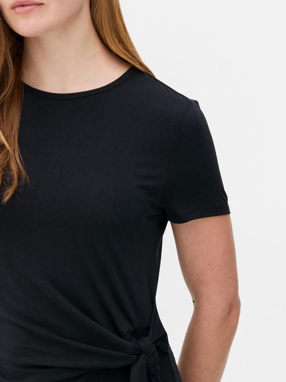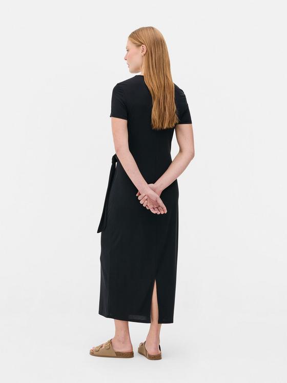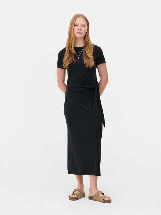Cut to an elegant midi length with a classic crew neckline, this black jersey dress is sophisticated pick you'll wear on repeat. The short sleeves made it ideal for warm, sunny days, meanwhile the knot detail to the waist lends a form-flattering finish. Wear it with your fave flat sandals for an effortlessly chic fit.