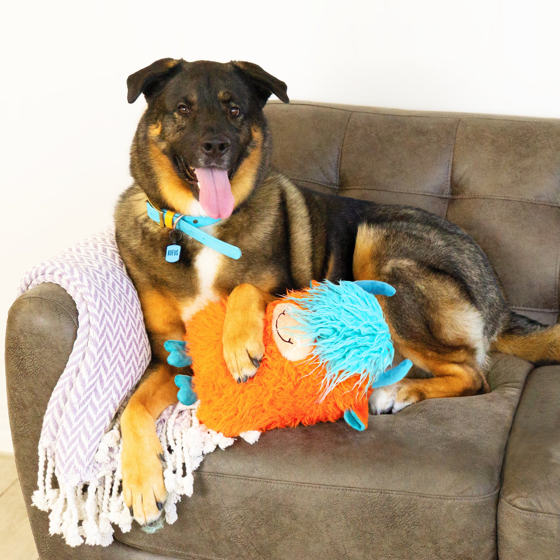 KONG Comfort Jumbo Highland Cow gives cool-cow vibes with its wild shaggy fur and floppy hair swoop. A giant plush body - with various fabric textures, 3 squeakers, and crinkle material inside each hoof and floppy hair - keeps dogs of all sizes entertained with multisensory features during playtime. When the party’s over, this cow’s laid-back attitude is perfect for chilling and cuddling during naptime.